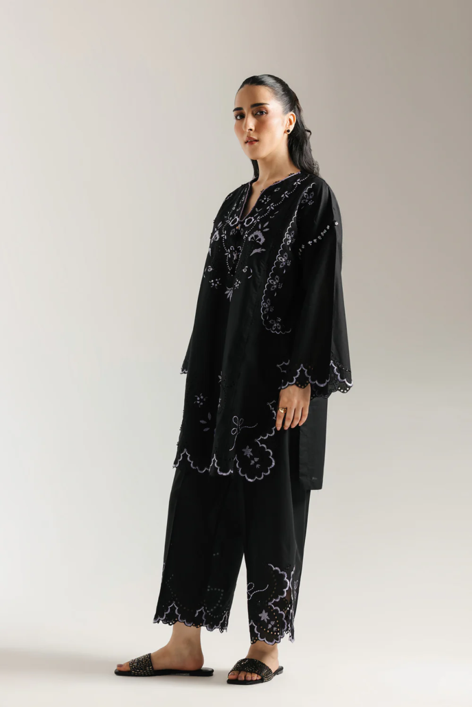 A study in bold contrast and delicate artistry. This exquisite suit features a rich black fabric beautifully adorned with intricate embroidery and delicate cutwork in a light, ethereal hue. The elegant, scalloped hemline of both the shirt and trousers creates a unique silhouette, while the detailed floral patterns on the neckline and sleeves add a layer of sophisticated charm. This is a timeless piece that embodies drama and grace in every stitch.