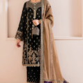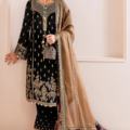 This sophisticated formal ensemble features richly embroidered pure velvet panels on the front and front sides, complemented by similarly embroidered velvet sleeves and borders on the front, back, and sleeves for a cohesive, luxurious appearance. The pure velvet back enhances durability and elegance, while the embroidered pure velvet bottom adds refined detail. Completing the look, the dupatta is crafted from organza with intricate embroidered applique and matching borders, combining texture and delicacy to elevate your formal wardrobe with expert craftsmanship and timeless style.