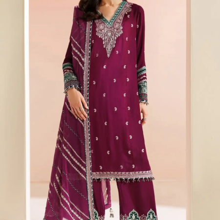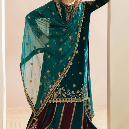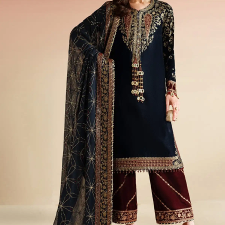 Elevate your formal wardrobe with the Embroidered Velvet Formal VF-2012. Crafted with pure velvet featuring intricate embroidery on the front and side panels, sleeves and trouser, and a digital printed organza dupatta, this outfit exudes elegance and sophistication. Perfect for any formal occasion, you’ll make a lasting impression with its luxurious velvet finish and delicate embroidery details.