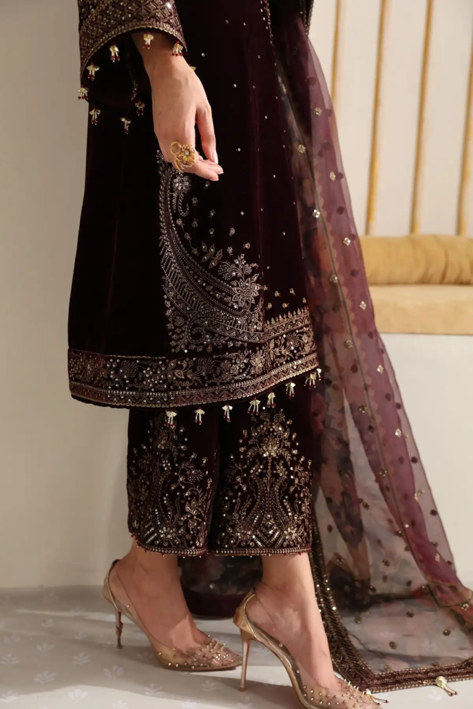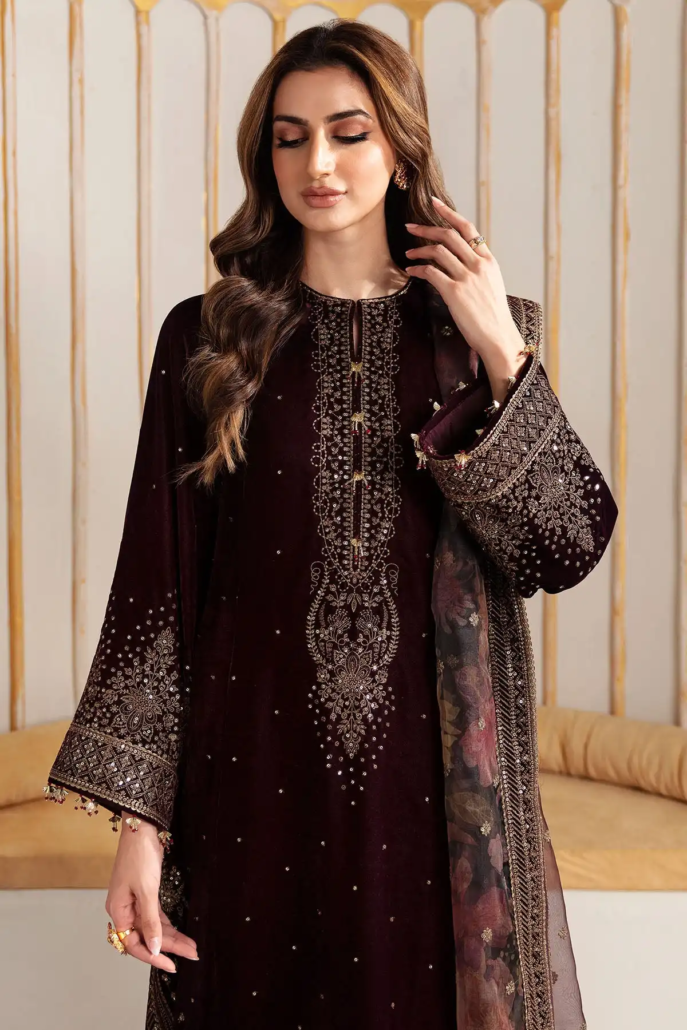 Elevate your formal wardrobe with the Embroidered Velvet Formal VF-2012. Crafted with pure velvet featuring intricate embroidery on the front and side panels, sleeves and trouser, and a digital printed organza dupatta, this outfit exudes elegance and sophistication. Perfect for any formal occasion, you’ll make a lasting impression with its luxurious velvet finish and delicate embroidery details.