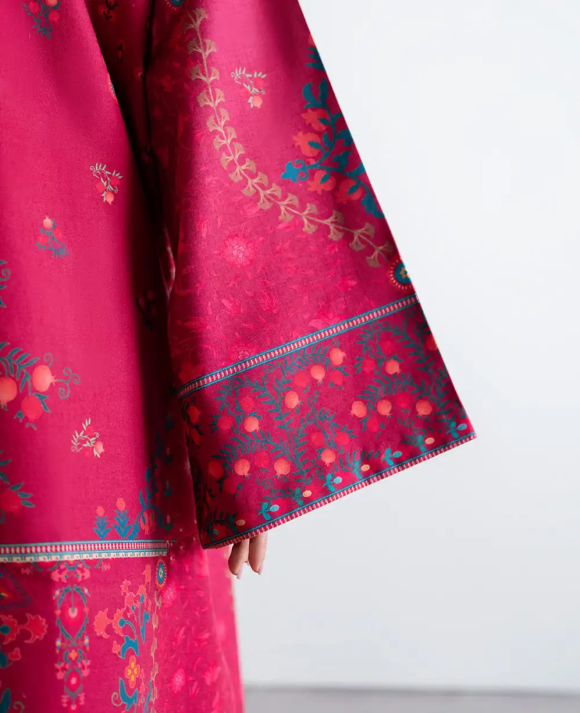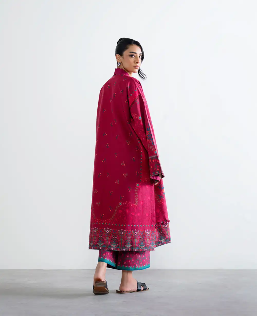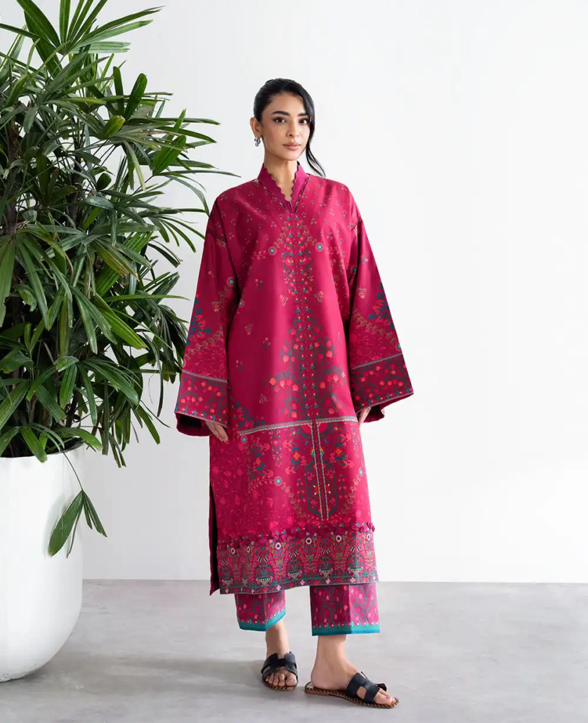 Inspired by Mughal artistry with a modern twist, this carmine red co-ord set features a vibrant tropical print, enriched with hints of lush green and deep red. The fusion of ethnic motifs and contemporary design makes it a bold yet refined choice for the season.