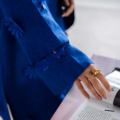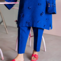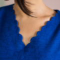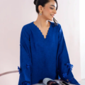 This cobalt blue two-piece set features a straight-cut kurta with a scalloped V neckline, adorned with delicate embroidery and 3D floral appliqué for added texture and charm. The statement sleeves are enhanced with tonal detailing and organza inserts, giving a modern twist to the classic silhouette. Paired with tailored straight pants, this look blends minimalism with contemporary elegance.