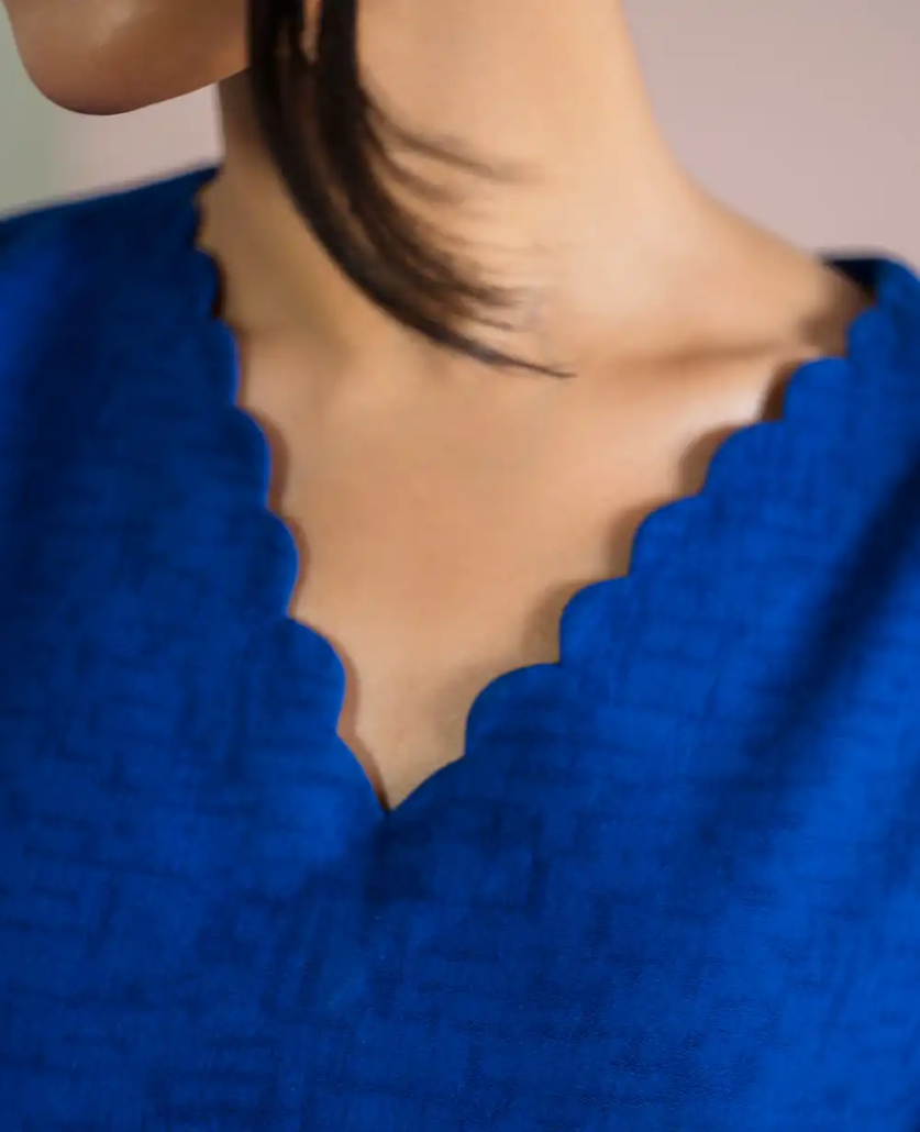 This cobalt blue two-piece set features a straight-cut kurta with a scalloped V neckline, adorned with delicate embroidery and 3D floral appliqué for added texture and charm. The statement sleeves are enhanced with tonal detailing and organza inserts, giving a modern twist to the classic silhouette. Paired with tailored straight pants, this look blends minimalism with contemporary elegance.