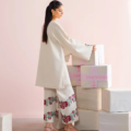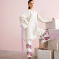 A refined warm white co-ord set crafted in luxurious self-jacquard fabric, designed to exude timeless sophistication. The shirt features stitching details and a unique flap collar neckline, paired with sleeves adorned with scallop edges and pin-stitch detailing for a delicate, intricate finish. The trousers, with their embellished embroidery, showcase a stunning French floral border, highlighted with soft hints of red coral and green, adding a touch of color to this sophisticated ensemble. A perfect blend of modern elegance and timeless craftsmanship.