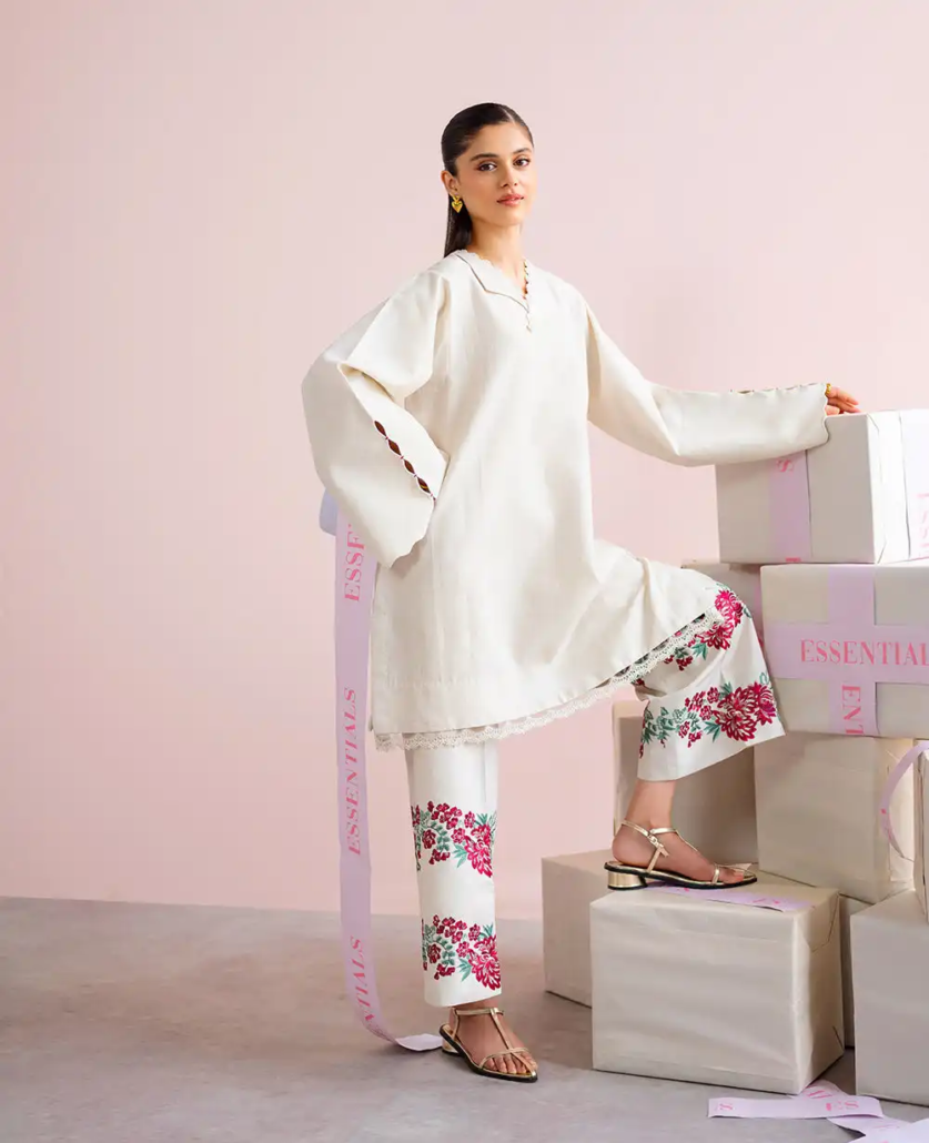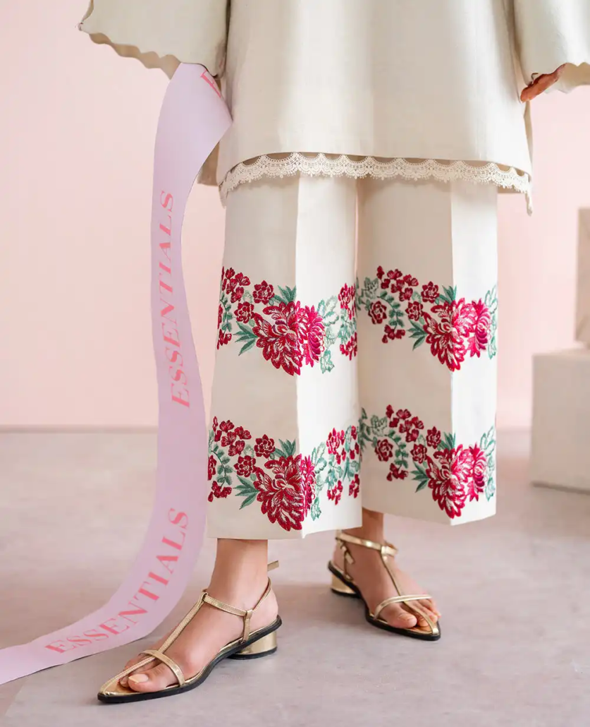 A refined warm white co-ord set crafted in luxurious self-jacquard fabric, designed to exude timeless sophistication. The shirt features stitching details and a unique flap collar neckline, paired with sleeves adorned with scallop edges and pin-stitch detailing for a delicate, intricate finish. The trousers, with their embellished embroidery, showcase a stunning French floral border, highlighted with soft hints of red coral and green, adding a touch of color to this sophisticated ensemble. A perfect blend of modern elegance and timeless craftsmanship.