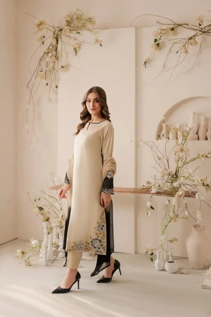 For the woman who knows her mind and is her own guiding light, a majestic kurta set in rich hues of beige and black. Featuring floral embroidered motifs, elevated with organza insertions in the sleeves and daaman, the Ghazal set is handcrafted for pure elegance. Each karigar spends a full-day in creating this intricate work of art and turn it into a masterpiece.