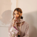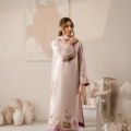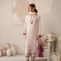 A striking blush pink rawsilk kaftan ensemble stuns with beautiful swan embroidered detailing in tones of lavender, green and purple. Lovely dupatta in three pastel tones adds up the perfect oomph to the outfit.