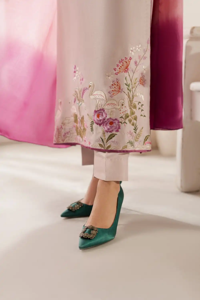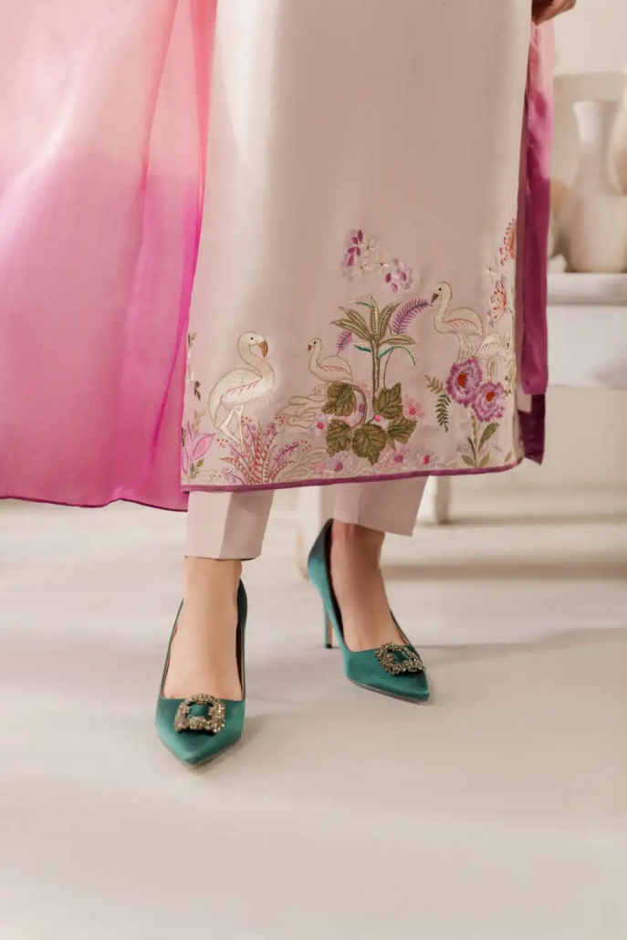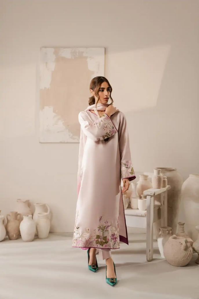 A striking blush pink rawsilk kaftan ensemble stuns with beautiful swan embroidered detailing in tones of lavender, green and purple. Lovely dupatta in three pastel tones adds up the perfect oomph to the outfit.