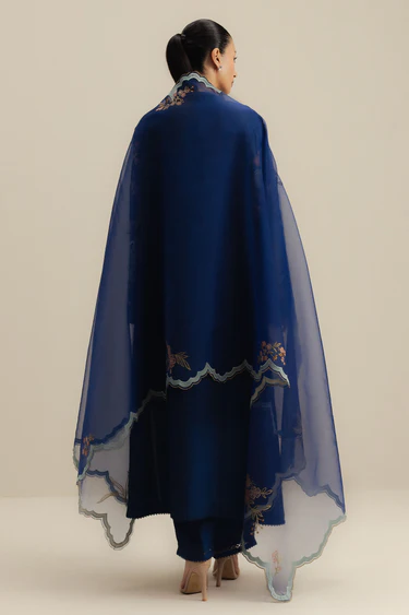 A cobalt blue outfit crafted from medium raw silk, blending classic elegance with intricate craftsmanship for a striking and refined look.