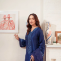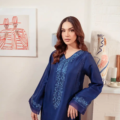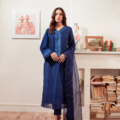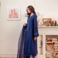 Crafted from Pure Raw Silk, Indigo exudes timeless elegance. Comfortable and wearable, the hand-embellished neckline is decorated with weaved detail. Pure organza detailing in the daaman, sleeves and floor grazing detail on the sides and hem make this perfectly elegant for that radiant glamour.