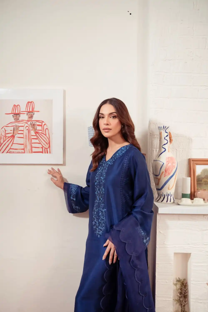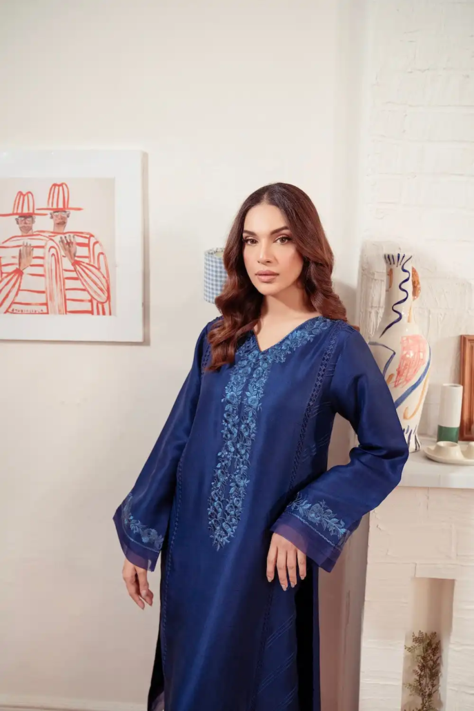 Crafted from Pure Raw Silk, Indigo exudes timeless elegance. Comfortable and wearable, the hand-embellished neckline is decorated with weaved detail. Pure organza detailing in the daaman, sleeves and floor grazing detail on the sides and hem make this perfectly elegant for that radiant glamour.