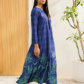 - This flared dress made in soft crepe fabric, in floral print, features crew neck with hook & eye closure at the back, full length sleeves and pleat detail along the front neck.