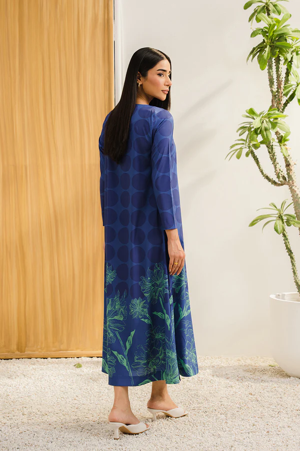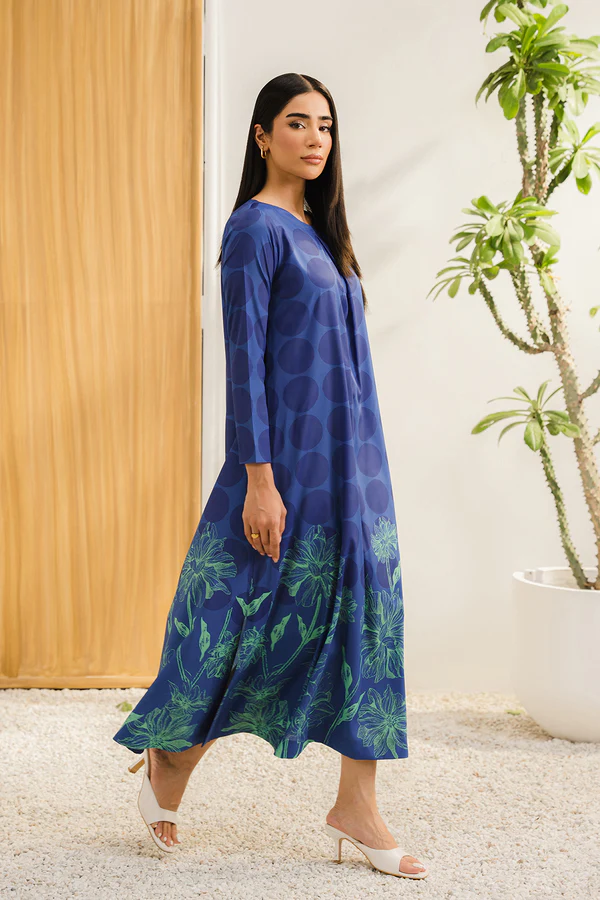 - This flared dress made in soft crepe fabric, in floral print, features crew neck with hook & eye closure at the back, full length sleeves and pleat detail along the front neck.