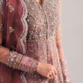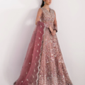 A dusty peach, 12-paneled pishwas featuring six panels on the front and six on the back. It showcases silver floral embroidery and a sequin jaal bodice, with florals embroidered sequin hem. The sleeves are adorned with floral motifs, followed by an embroidered border, lace insertion, and a pink satin sequin border, all culminating in lace and loop detailing. The contrasting pink dupatta features a scalloped, four-sided border and sequin floral accents in the center. The ensemble is completed with a plain raw silk inner lehenga with leafy border at the hem.