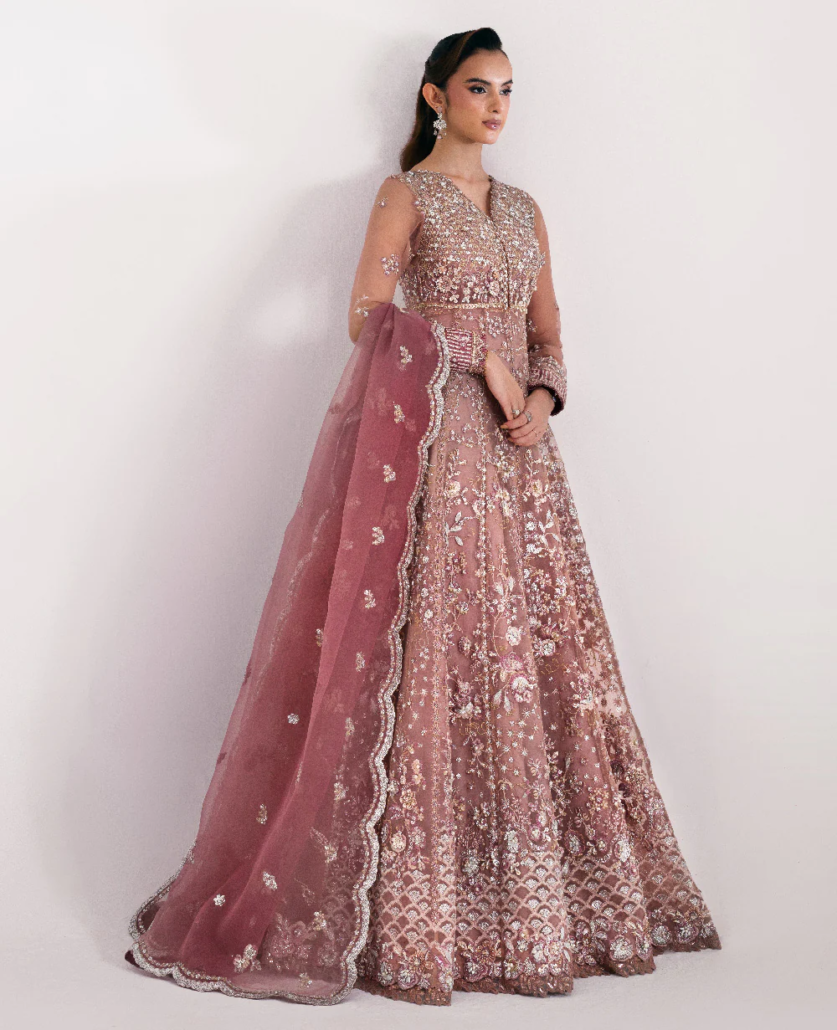 A dusty peach, 12-paneled pishwas featuring six panels on the front and six on the back. It showcases silver floral embroidery and a sequin jaal bodice, with florals embroidered sequin hem. The sleeves are adorned with floral motifs, followed by an embroidered border, lace insertion, and a pink satin sequin border, all culminating in lace and loop detailing. The contrasting pink dupatta features a scalloped, four-sided border and sequin floral accents in the center. The ensemble is completed with a plain raw silk inner lehenga with leafy border at the hem.