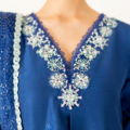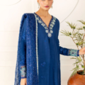 Kayra – A portrait of quiet sophistication. Rendered in a serene blue, Kayra features a pure raw silk shirt adorned with intricate tonal embroidery and hand ample fine threadwork along the neckline and sleeves – blending elegance with subtle depth. The look is finished with a delicately embroidered organza dupatta, framed with a refined lace border, and sleek raw silk trousers that complete the ensemble with a polished touch. Elevated, effortless, and beautifully composed.