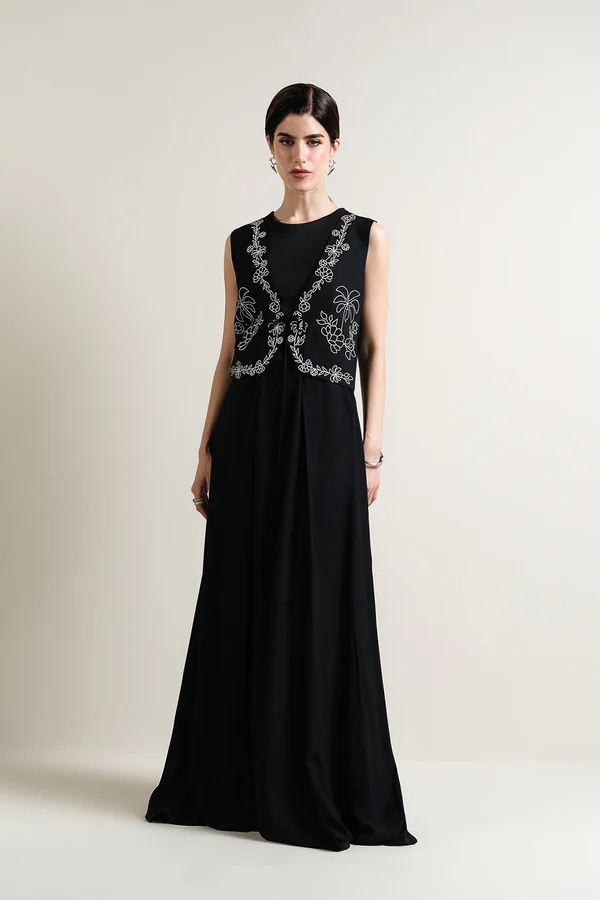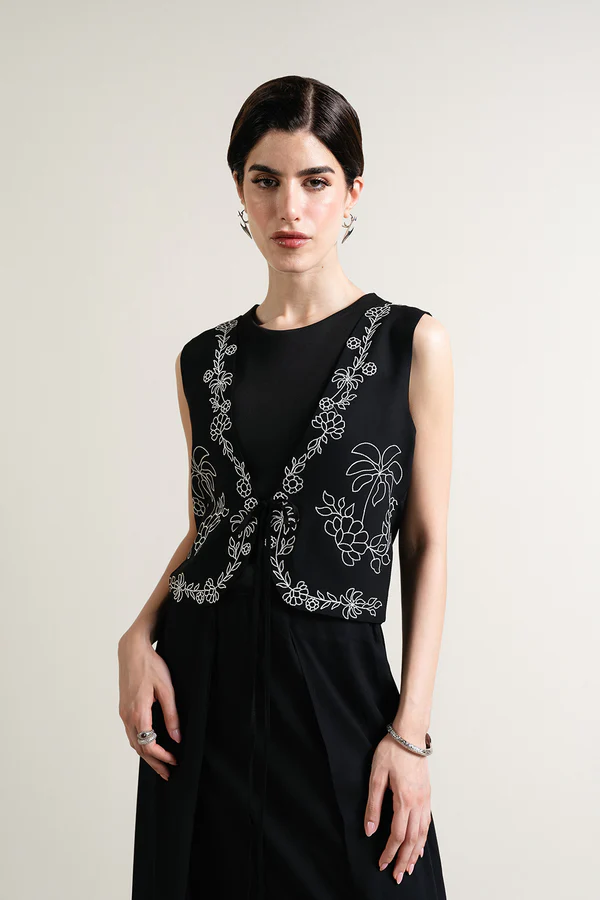 - Crafted from viscose, this sleeveless piece features delicate palm tree line-art embroidery on the front. Designed with a short vest-style cut, it includes a V-neckline and a front tie-up closure. Pair it with ‘Konar skirt’ to complete the look. Fully lined for a neat, comfortable finish. Pair it with ‘Konar Skirt’ to complete the look.
