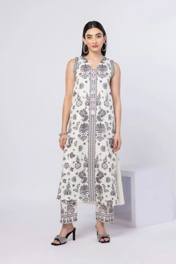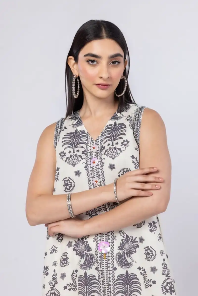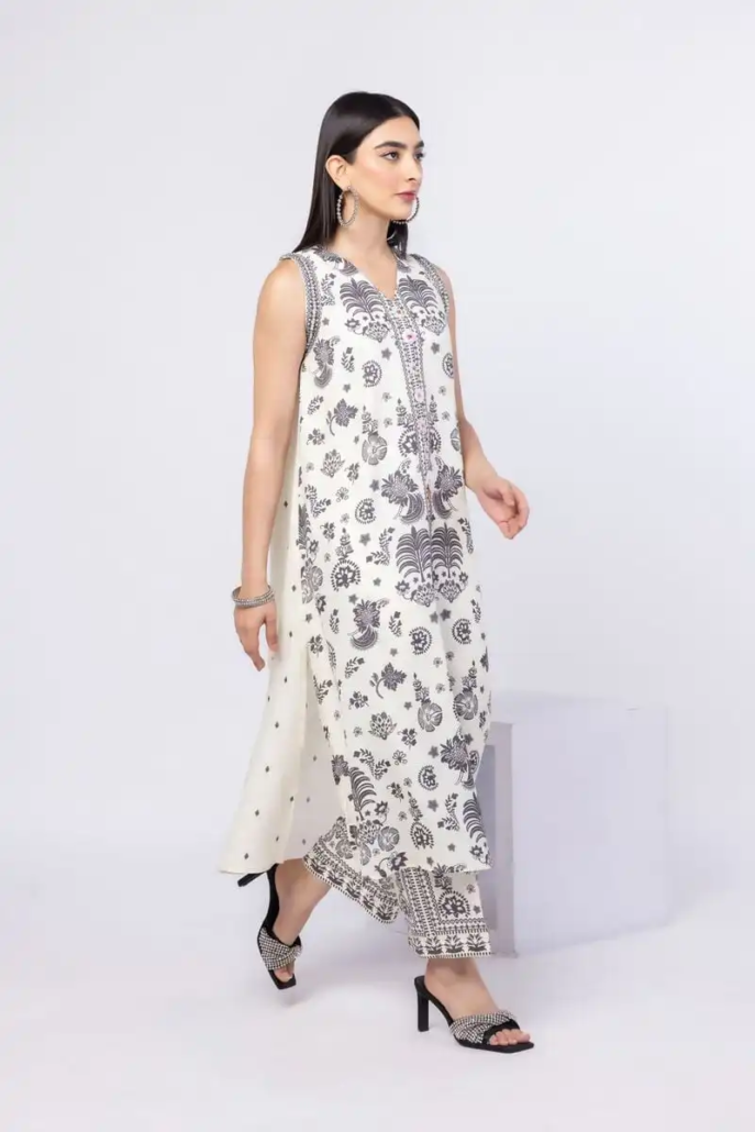 A long floral printed kurta featuring a sleeveless design and a round neckline with floral embellishments.