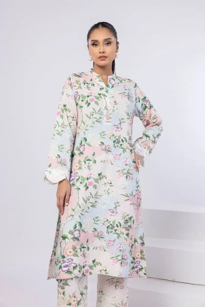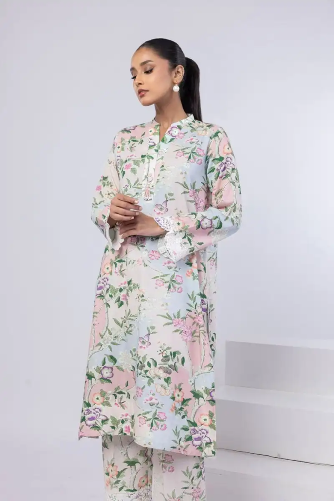 A long floral printed kurta featuring full embroidered sleeves and a neckline with a V-cut accentuated with button detailing and embellishments.