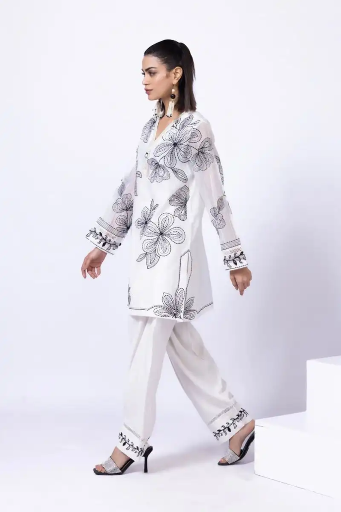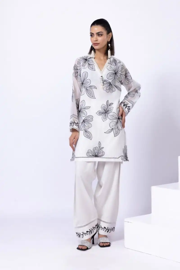 - Description:Â A short embroidered kurta featuring full sleeves with pintuck detailing and lace inserts along with a V-neckline.