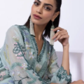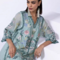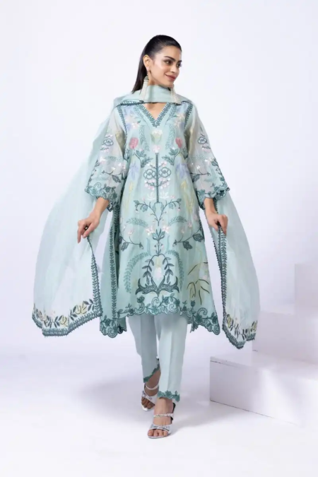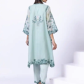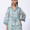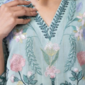 - Description:Â A long floral embroidered kurta featuring short sleeves and a V-neckline.