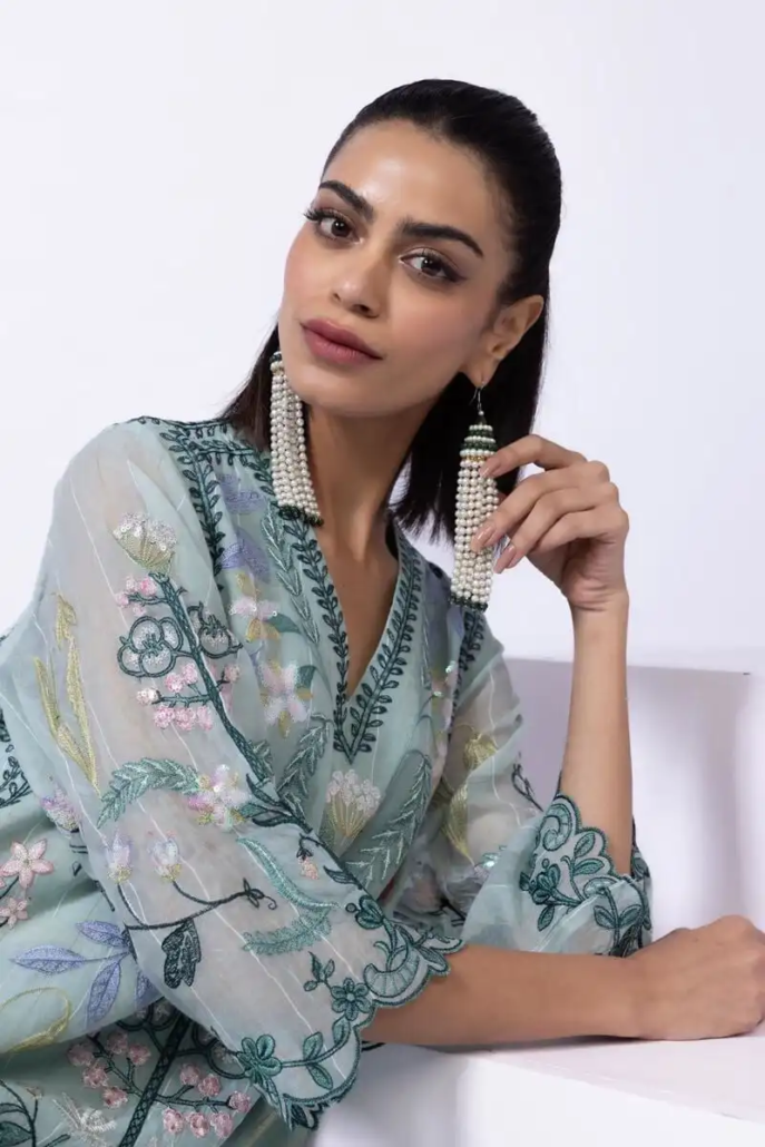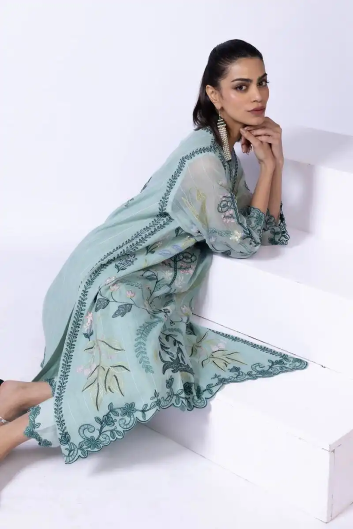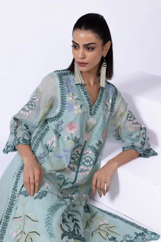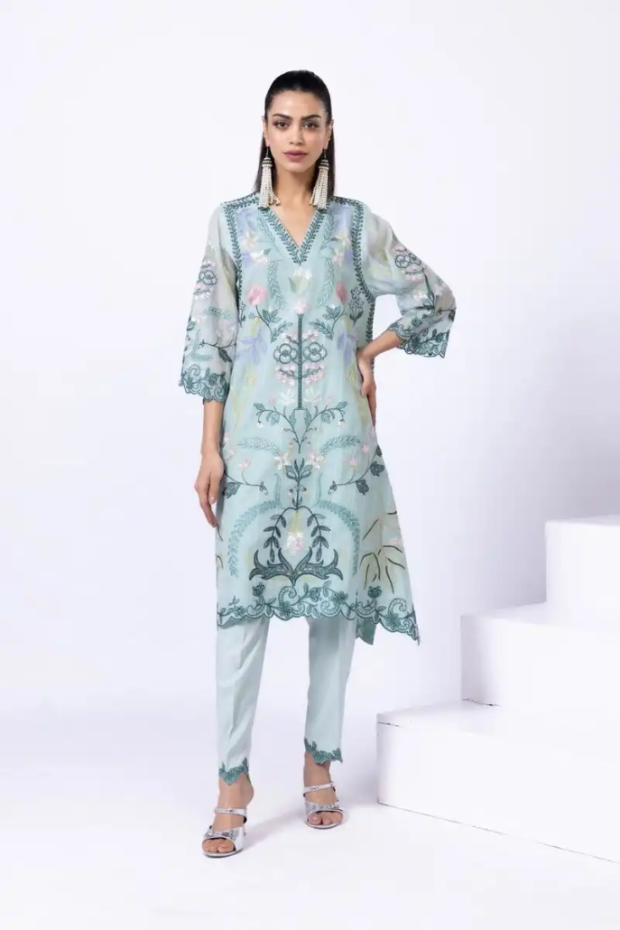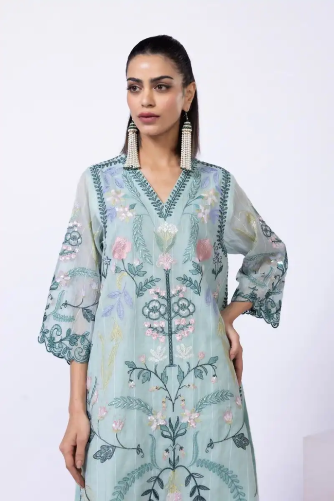 - Description:Â A long floral embroidered kurta featuring short sleeves and a V-neckline.