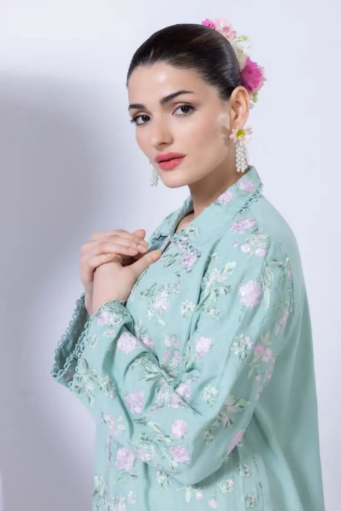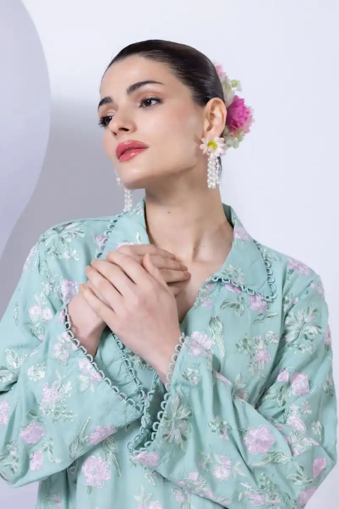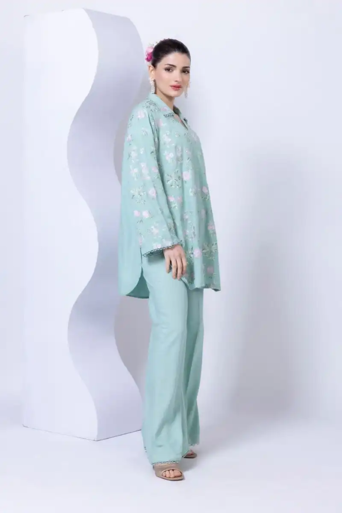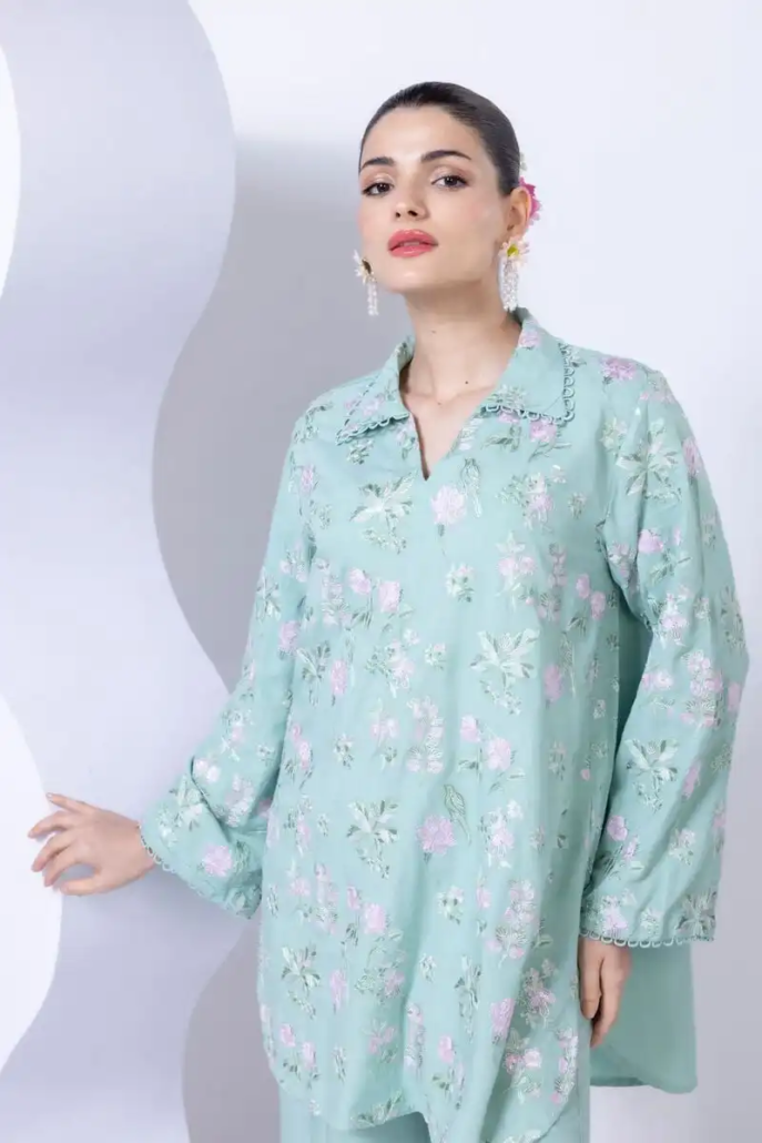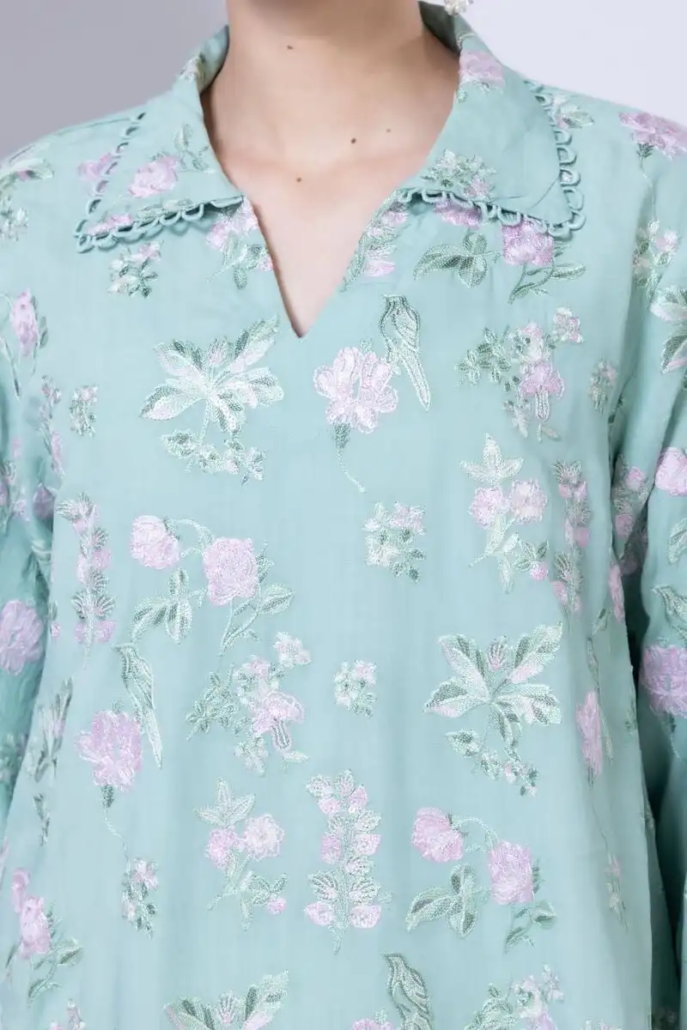 - Description:Â A short floral embroidered kurta featuring full sleeves and a wing collar.