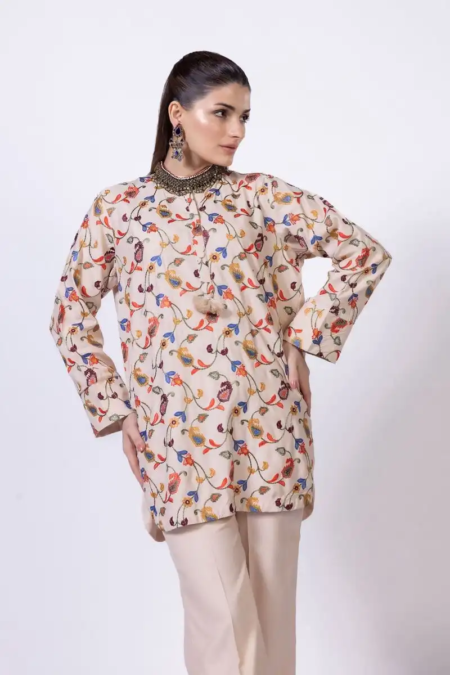 - Description:Â A short embroidered kurta featuring full sleeves and a band collar with a V-cut.