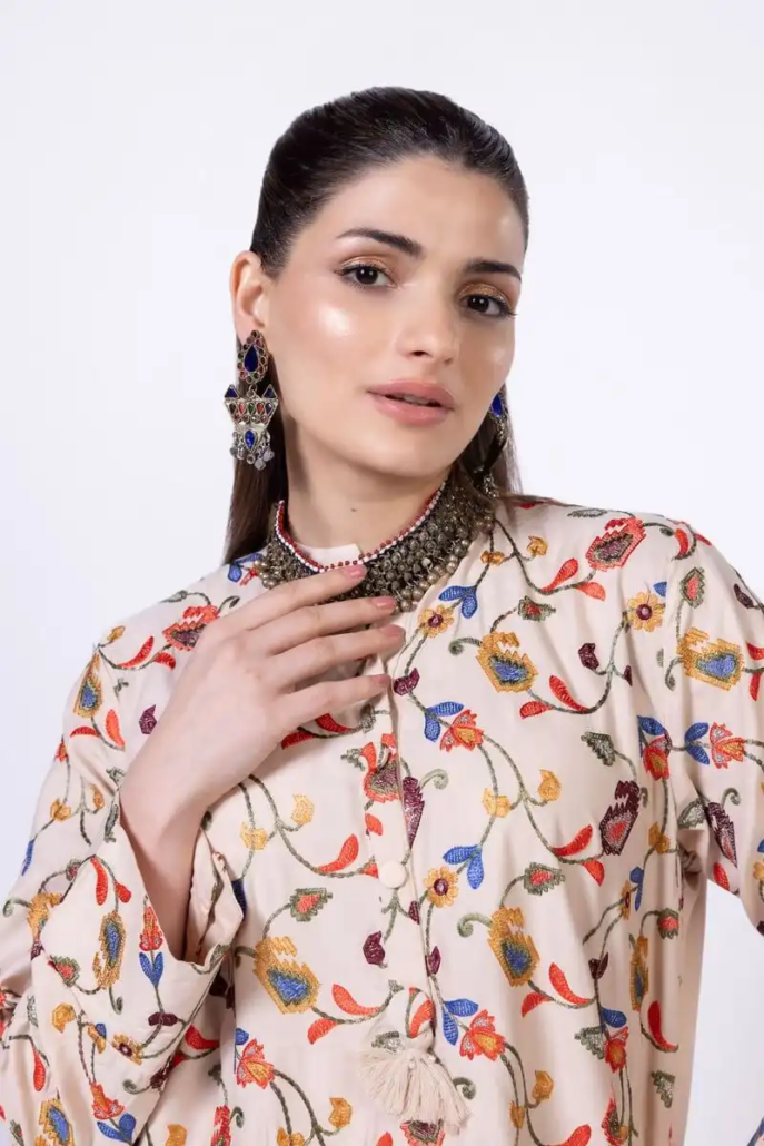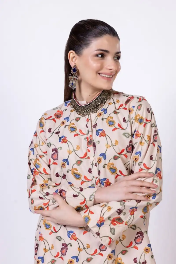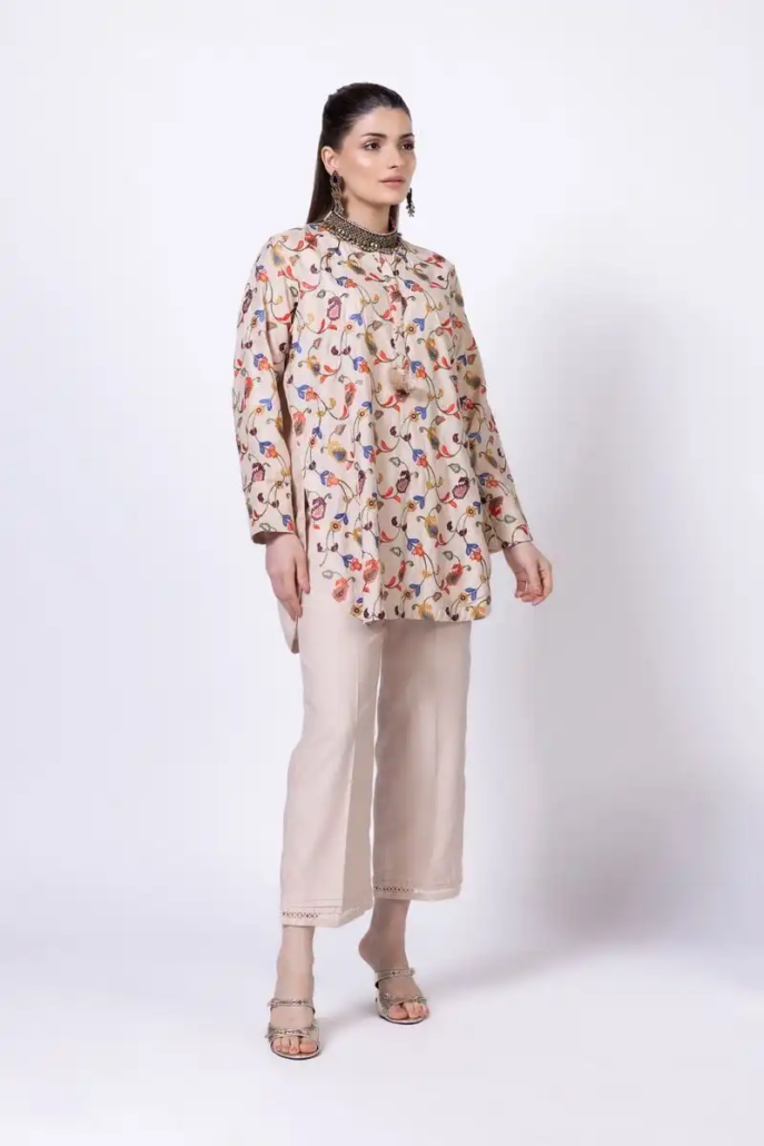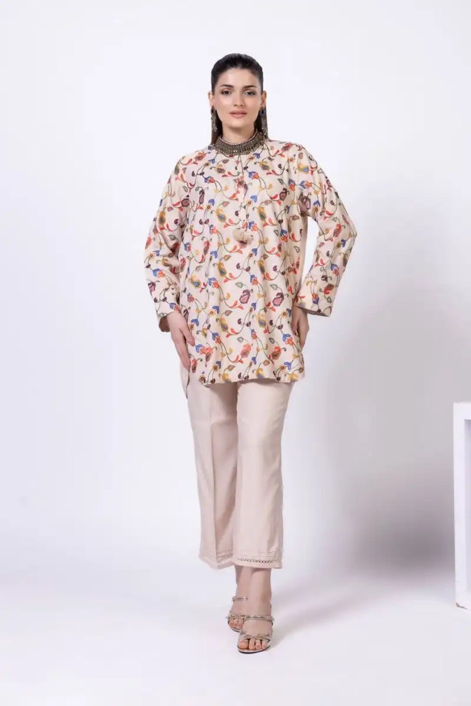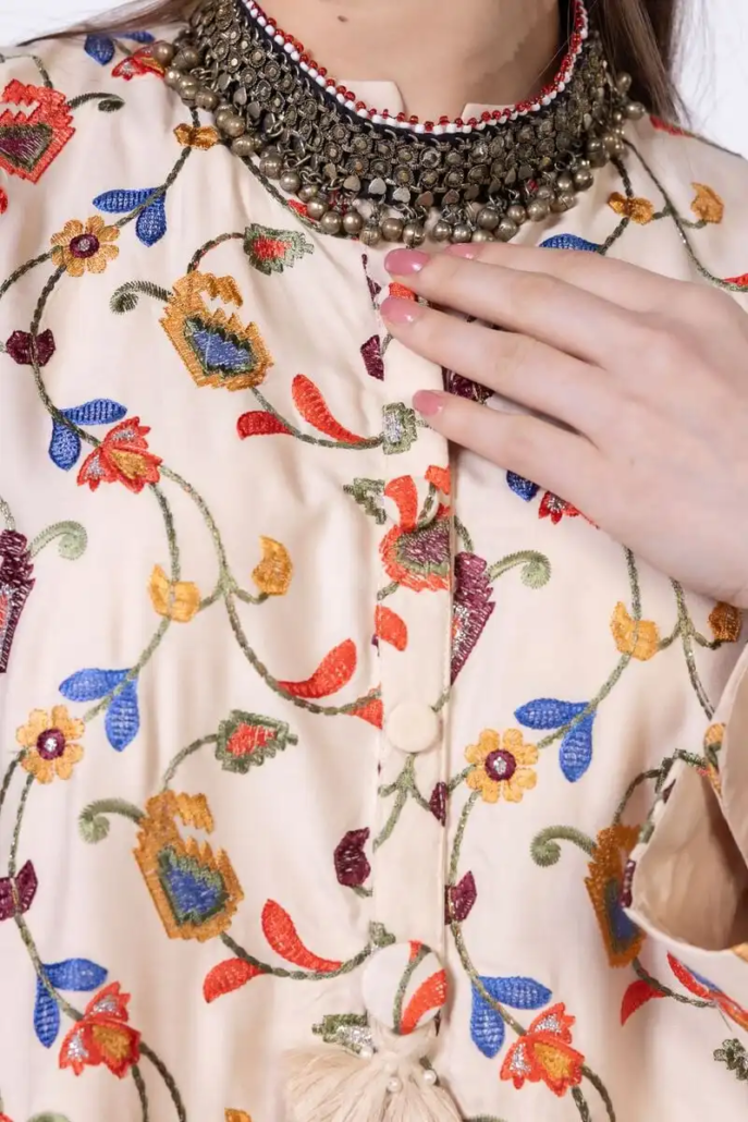 - Description:Â A short embroidered kurta featuring full sleeves and a band collar with a V-cut.