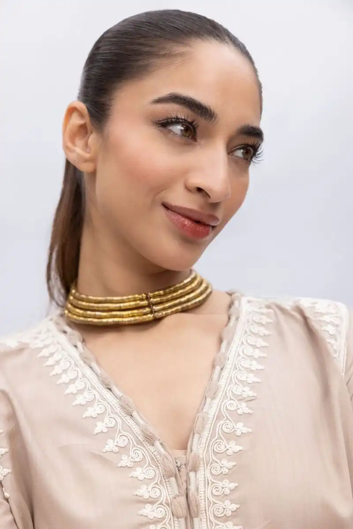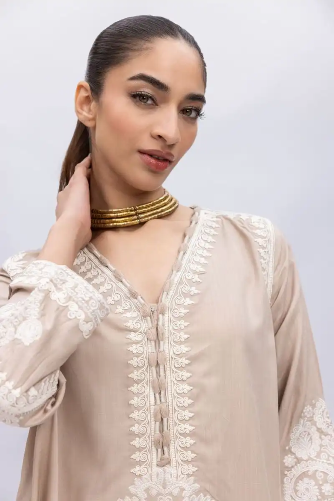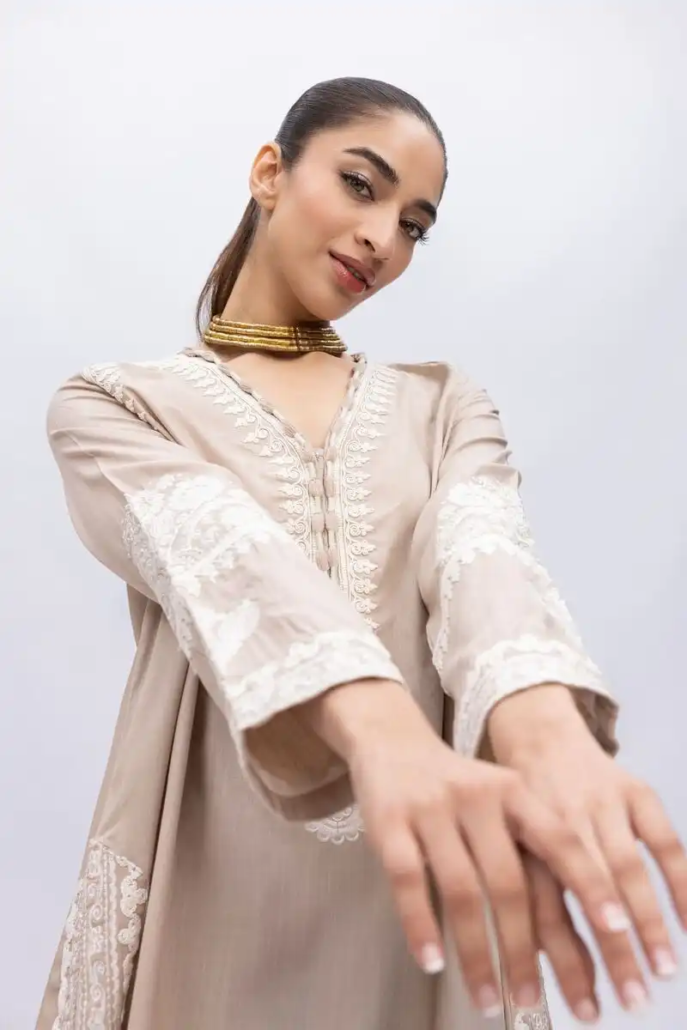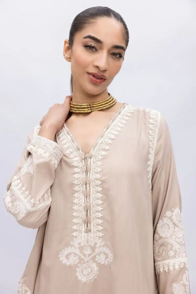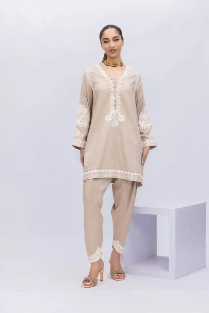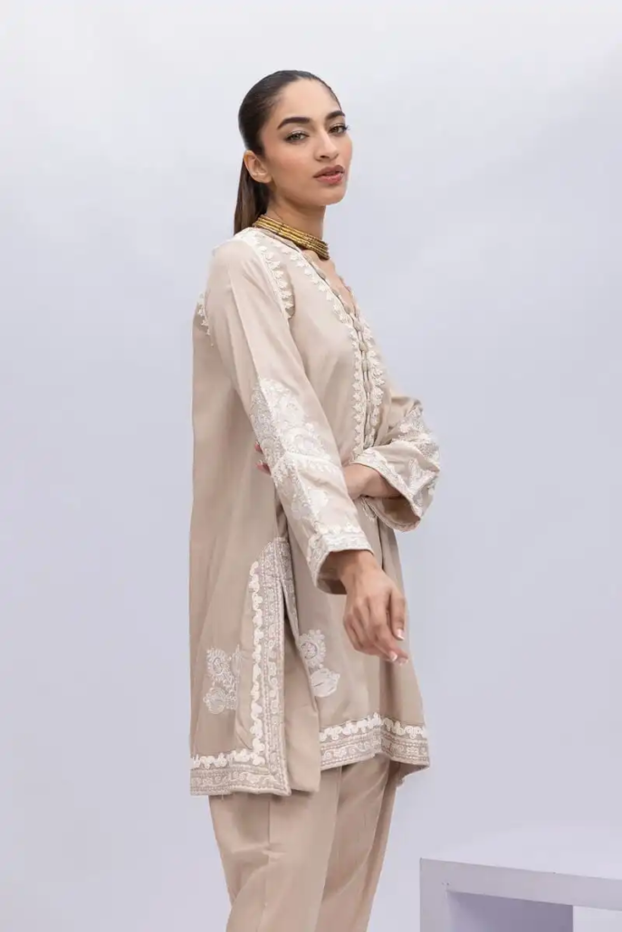 A short embroidered kurta featuring full sleeves and a neckline with a V-cut.