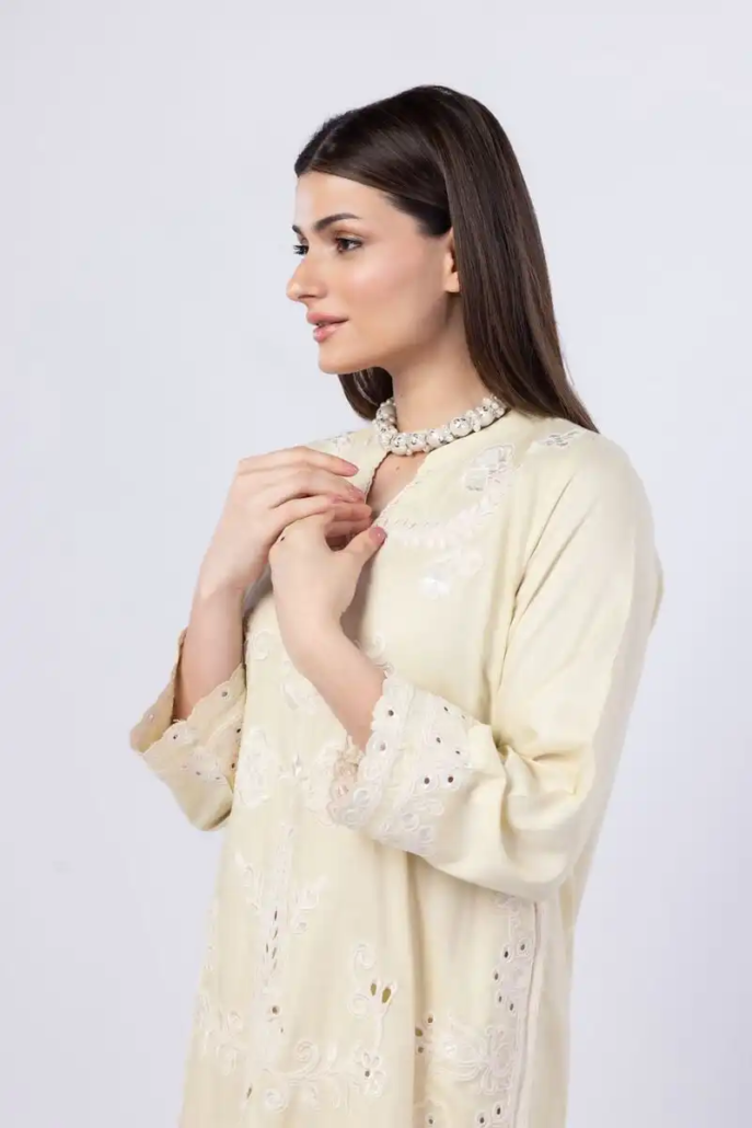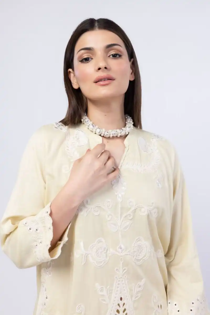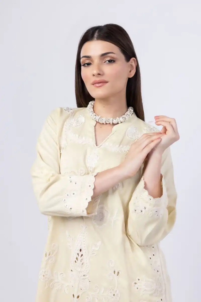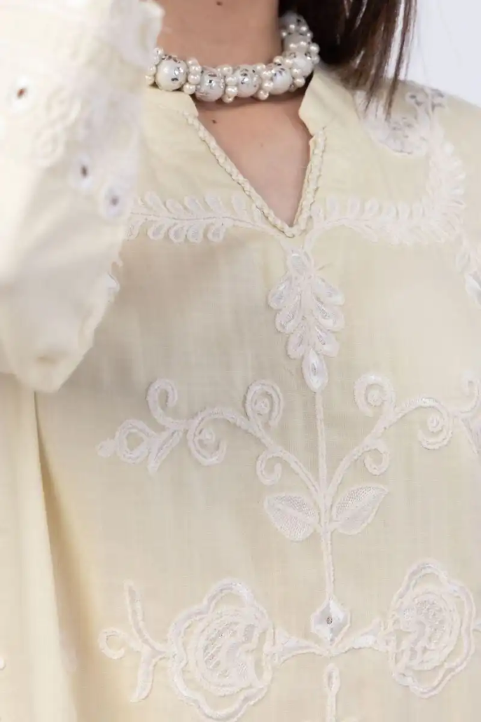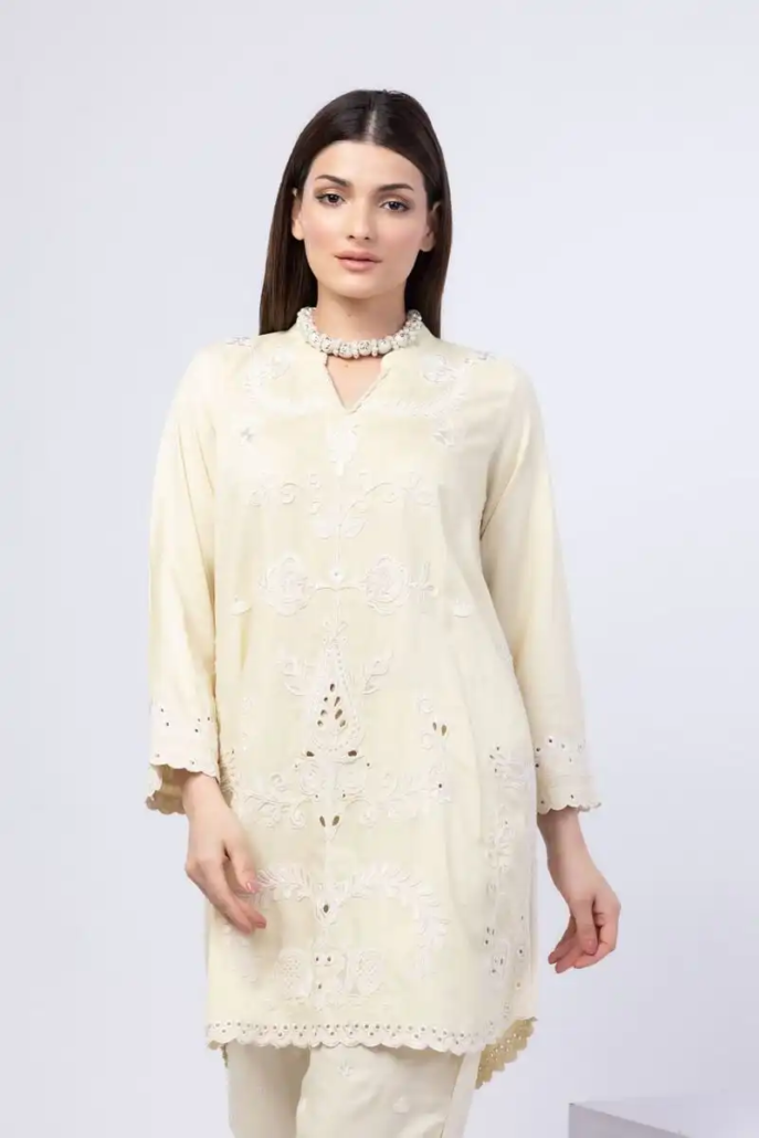 A short floral embroidered kurta featuring full sleeves and a band collar with a V-cut.