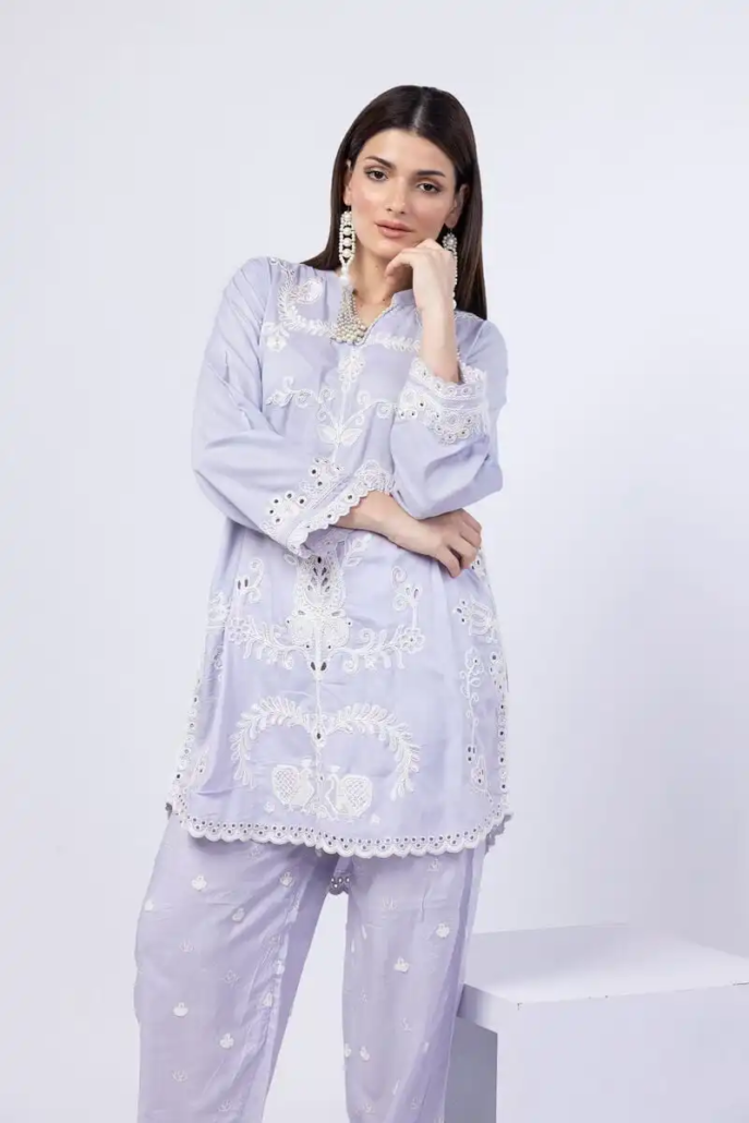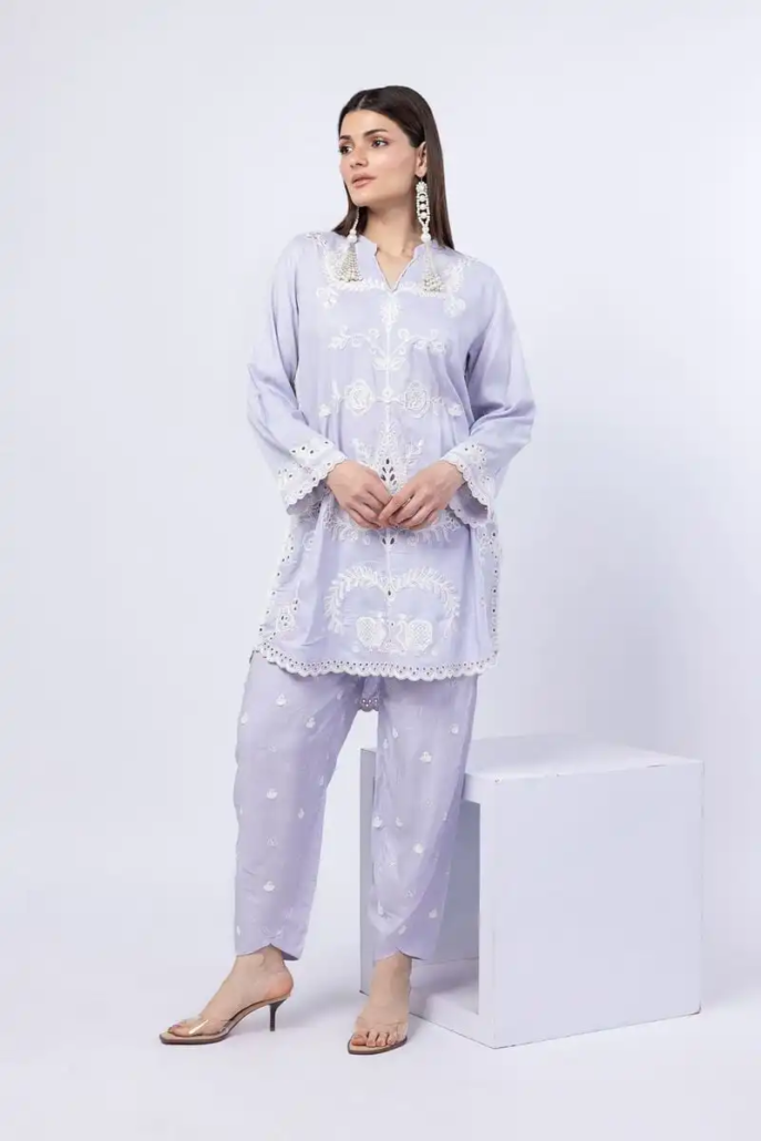 A short floral embroidered kurta featuring full sleeves and a band collar with a V-cut.