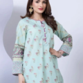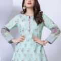 - Description:Â A short floral hand block printed kurta featuring full sleeves and a round neckline with a V-cut.