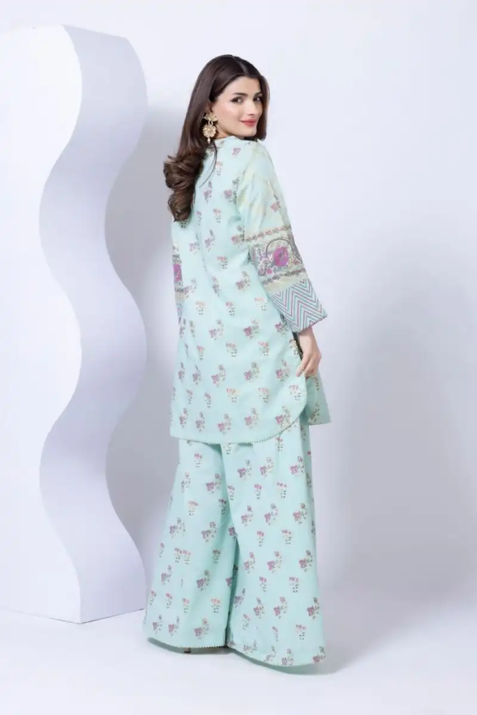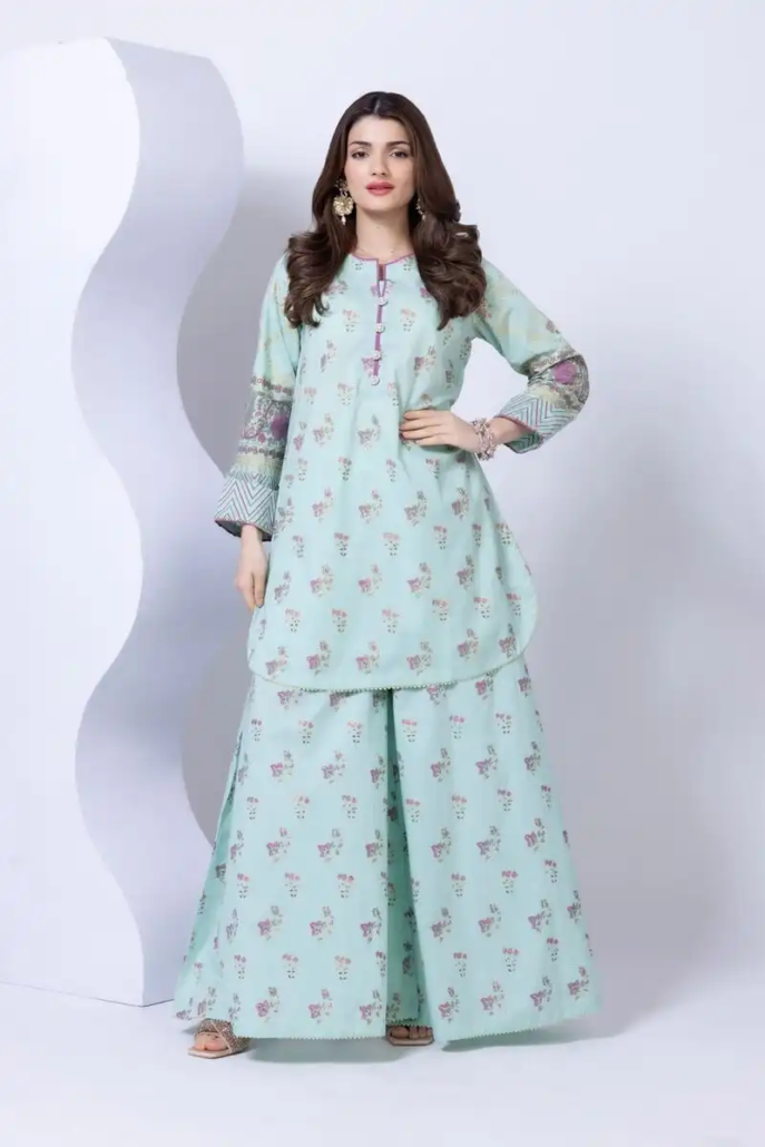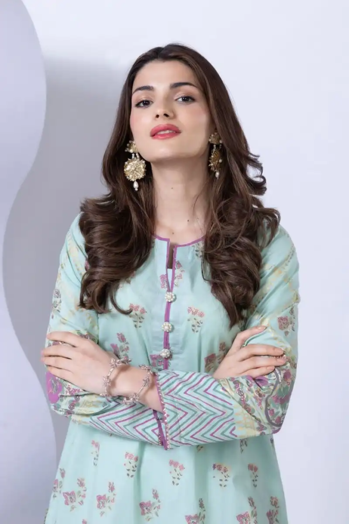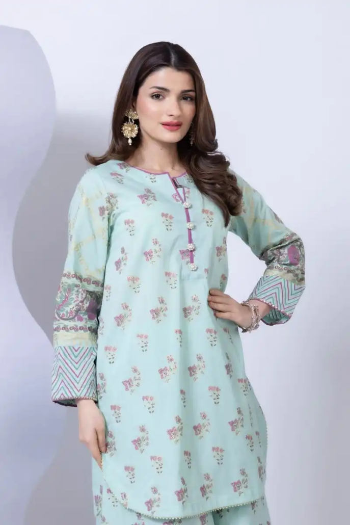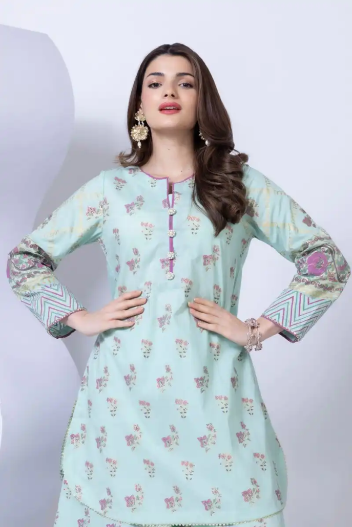 - Description:Â A short floral hand block printed kurta featuring full sleeves and a round neckline with a V-cut.