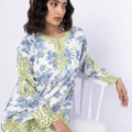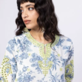 - Description:Â A long floral print embroidered kurta featuring full sleeves and a round neckline.