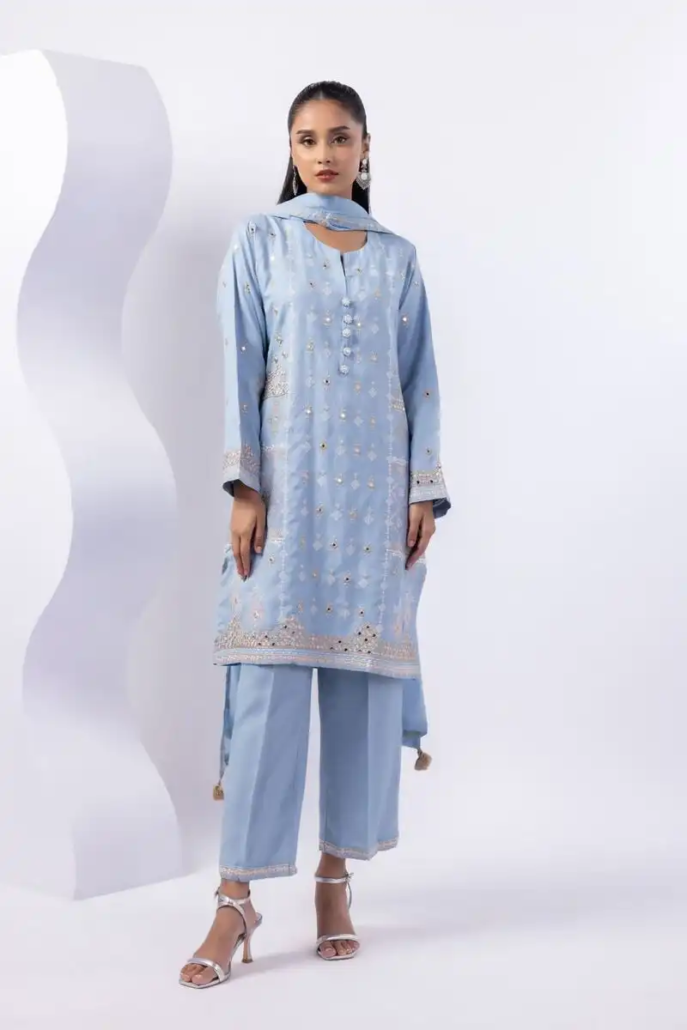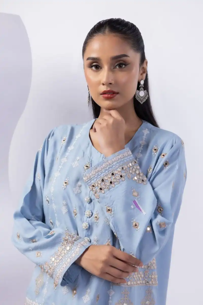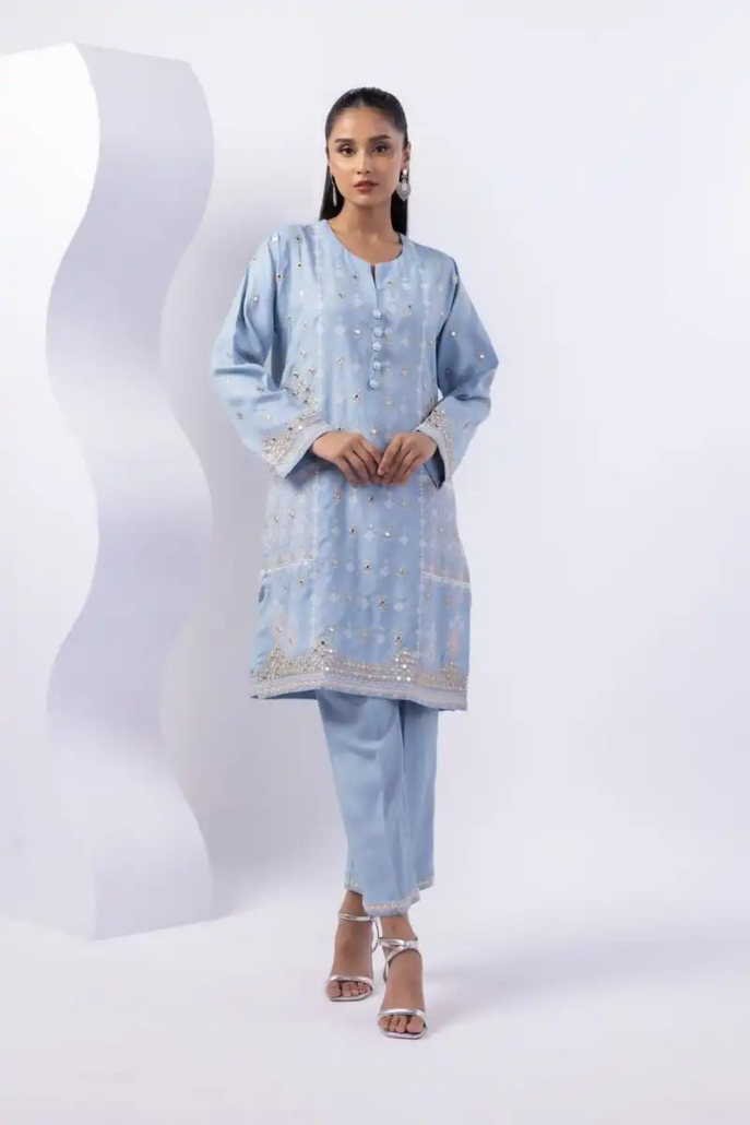 - Description:Â A floral embroidered kurta featuring full sleeves and a round neckline.
