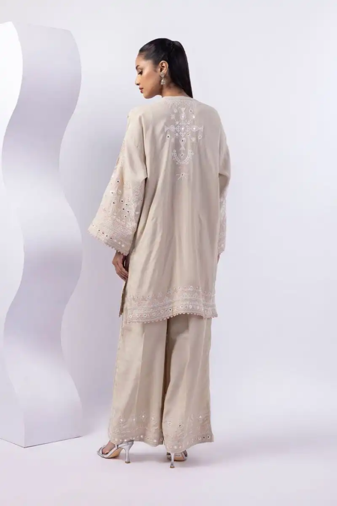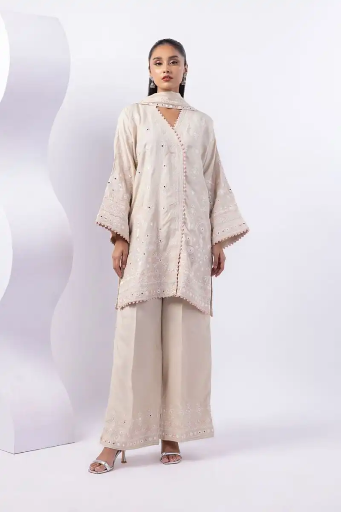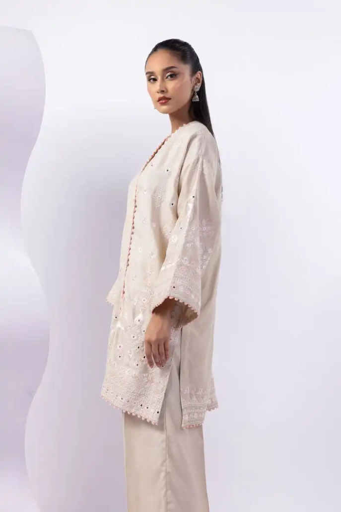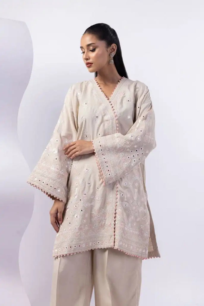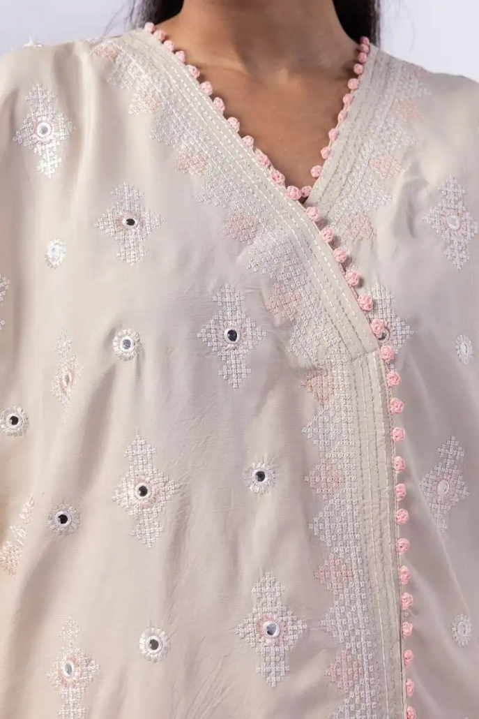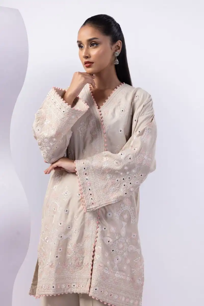 A floral embroidered kurta featuring full sleeves with mirror work detailing and a neckline with a V-cut.