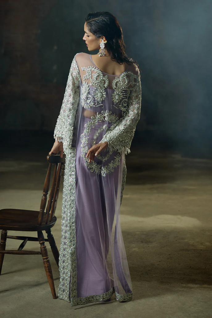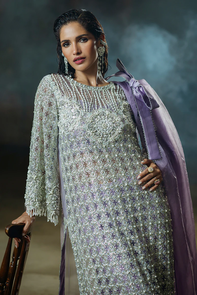 A stunning blend of elegance and sophistication, featuring an embroidered net shirt paired with luxurious raw silk trousers. The look is completed with an ethereal organza dupatta for timeless elegance.