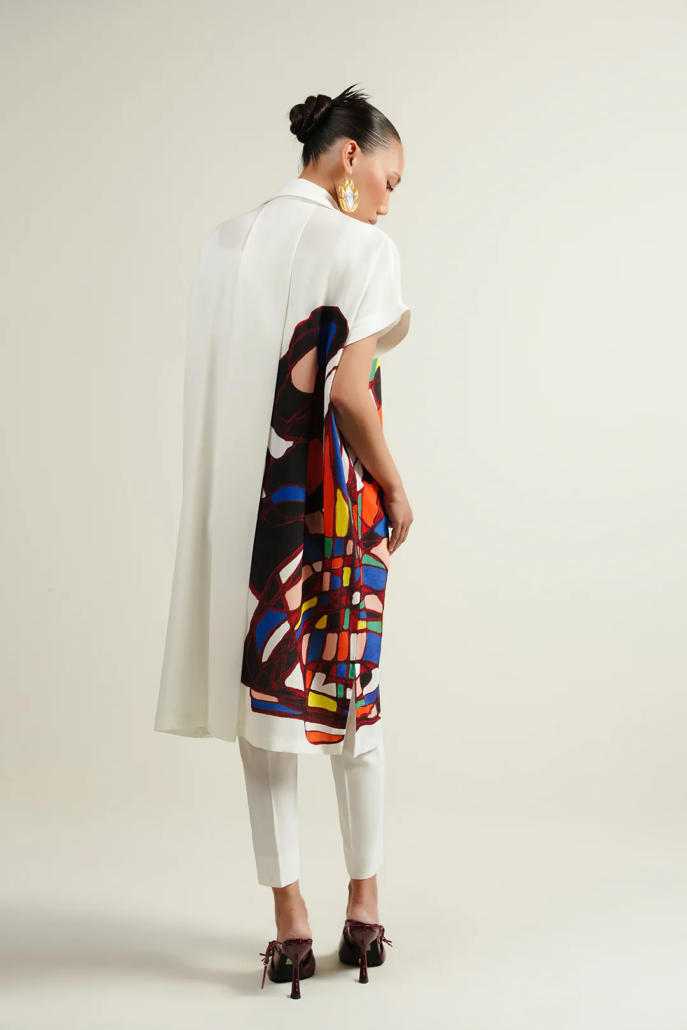 - Crafted from soft printed crepe, this dress features a Johnny collar and relaxed drop shoulders finished with cuff detailing. The straight-cut silhouette is complemented by a box pleat at the back, adding subtle volume and ease to the design.