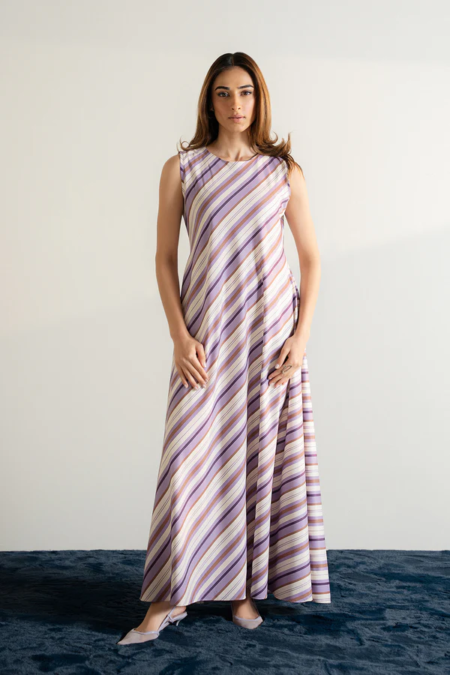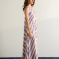 - This dress, made in soft crepe fabric, features crew neckline with closure at the back, sleeveless and flared hem.