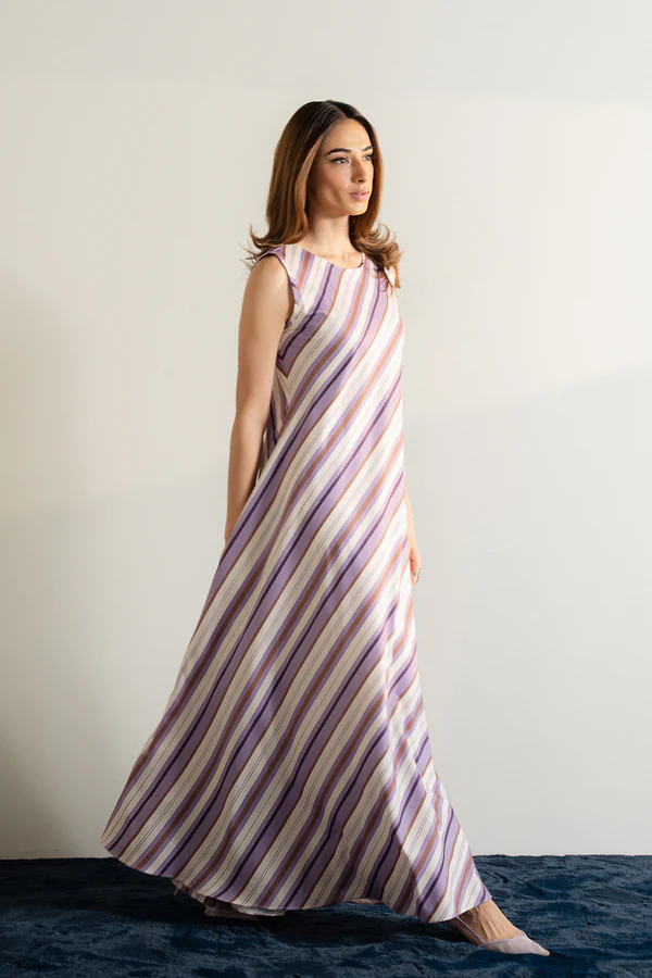 - This dress, made in soft crepe fabric, features crew neckline with closure at the back, sleeveless and flared hem.