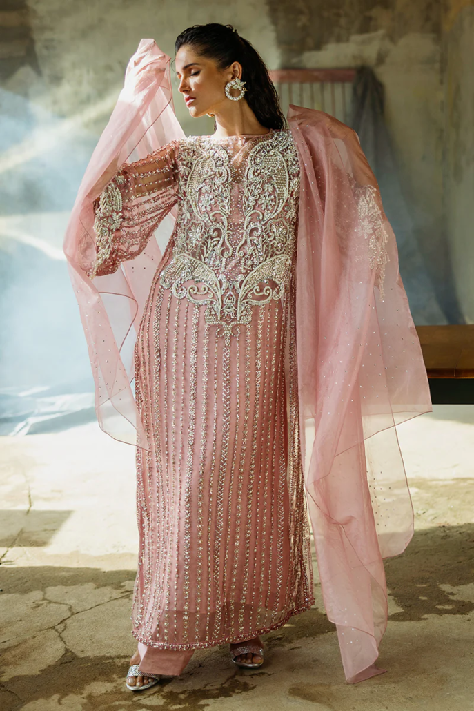 A stunning blend of elegance and sophistication, featuring an embroidered net shirt paired with luxurious raw silk trousers. The look is completed with an ethereal organza dupatta for timeless elegance.