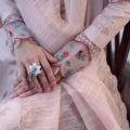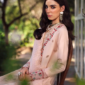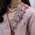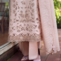 Gracefully crafted with a three-panel lawn shirt, this ensemble features stunning laser embroidered floral details that enhance its delicate charm. The floral neckline, adorned with a lacy embroidery insertion, adds an intricate touch, while hints of red and green infuse the design with vibrant color. The fancy yarn dupatta complements the look, paired perfectly with cambric pants for a refined, elegant finish.