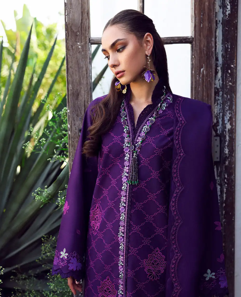 Embodying timeless elegance, this anghrakha-style lawn shirt is beautifully embroidered in intricate chicken kari with a blend of soft lilacs and pinks. Crochet laser patches on the front add a modern twist to the classic design, while the organza hem embroidery border offers delicate finishing touches. The scalloped organza dupatta, featuring floral-composed corner pallus, enhances the ensemble’s grace. Paired with cambric pants, this outfit is a perfect fusion of traditional charm and contemporary style.