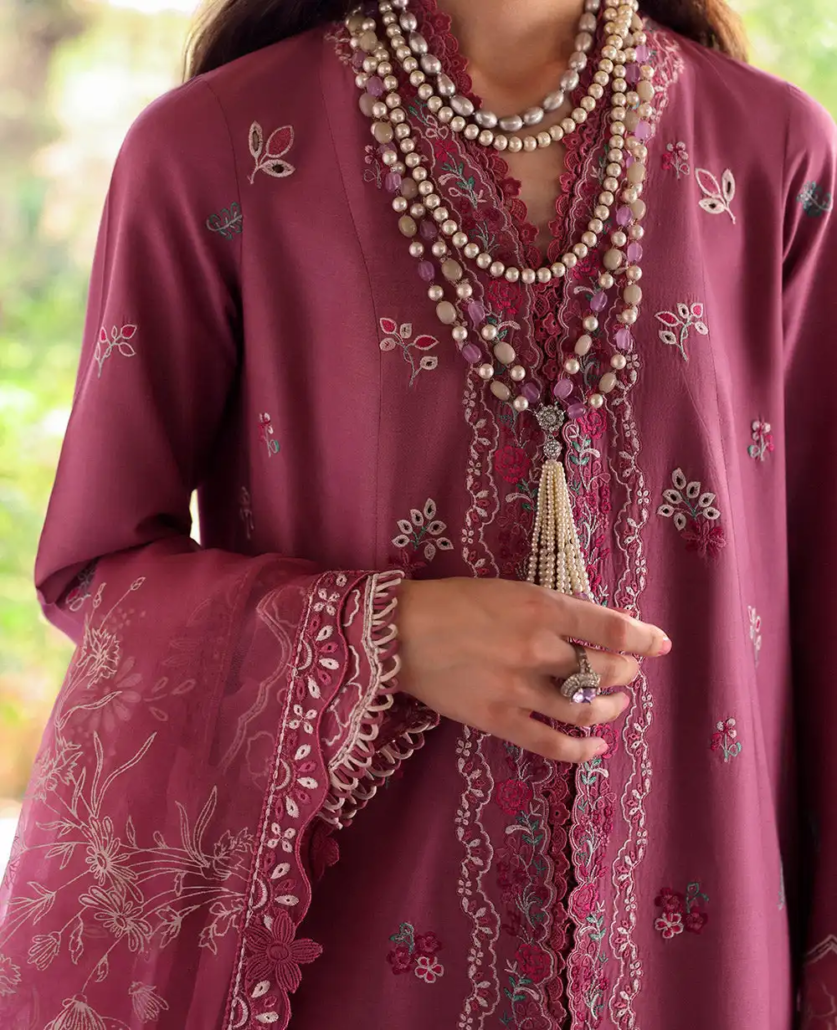 A stunning lawn fabric creation featuring a front-open, long-length silhouette in a rich palette of pinks, greens, and subtle hints of white. The embroidery showcases intricate mesh techniques with delicate floral motifs, adding depth and elegance. Organza borders on the sleeves enhance the overall design, while the cambric pants provide a perfect complement. The organza dupatta, adorned with a paste print and a four-sided embroidered border, completes this refined and graceful ensemble.