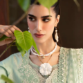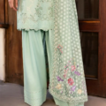 Embrace the elegance of summer with this lawn ensemble! The three-paneled shirt features a delicate trellis embroidered pattern, brought to life with floral motifs using the needle bore technique. The embroidery showcases refreshing shades of green. Paired with a steple bindi dupatta, boasting colorful embroidered pallus in shades of lilacs, pinks, and yellows, this outfit is a true celebration of color and craftsmanship. The cambric pants complete the look, offering both comfort and style.