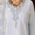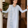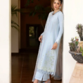 Dive into the serene beauty of sky blue! This lawn shirt features a three-panel design with bold floral laser work and color blocking. The modern, scalloped neckline is enhanced with schiffli lace. Delicate white embroidery adds a touch of elegance. The cream contrast dupatta, adorned with shades of blue floral embroidery, completes the look. Paired with cambric pants, this outfit is perfect for a fresh & stylish statement.