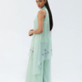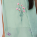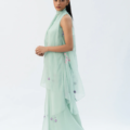 - This green embroidered top made in soft silk fabric features crew neck with scarf detail, back neck slit with hook & eye closure and asymmetric hem. The top is sleeveless.