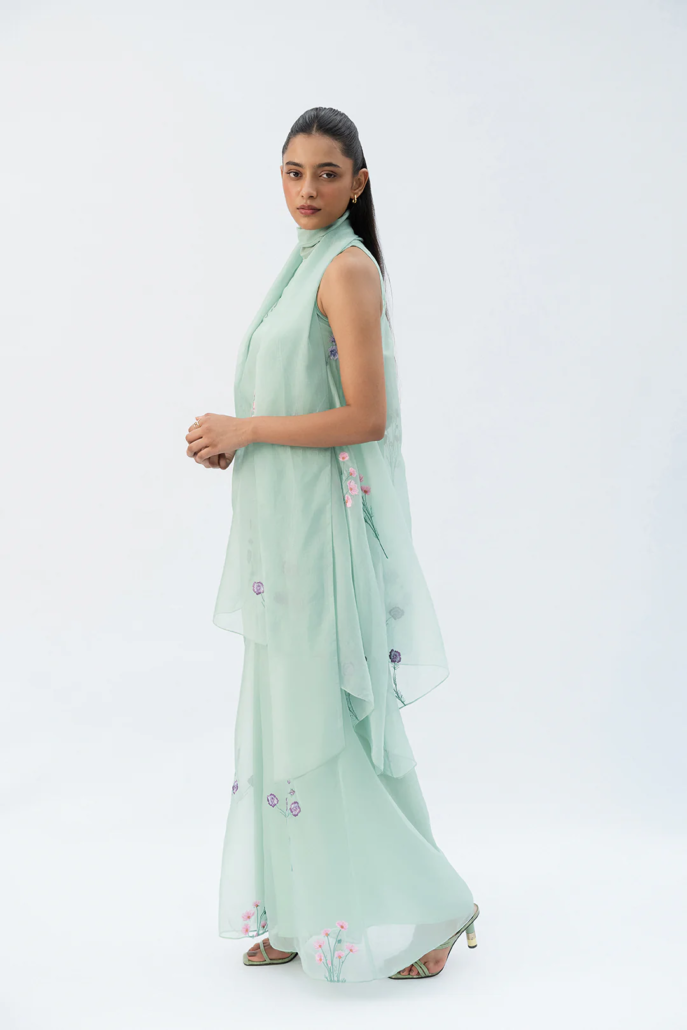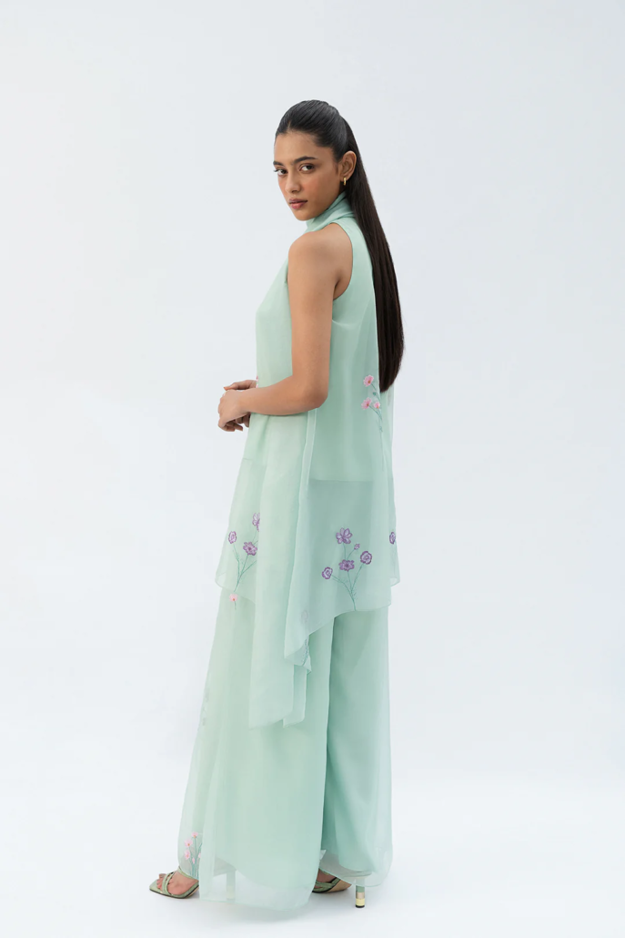 - This green embroidered top made in soft silk fabric features crew neck with scarf detail, back neck slit with hook & eye closure and asymmetric hem. The top is sleeveless.