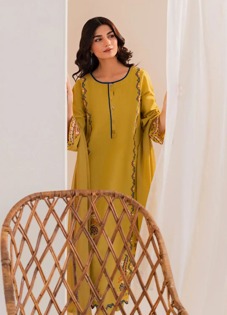 Elevate your wardrobe with this exquisite 2 piece embroidered outfit in a serene lime green hue. Crafted from premium quality lawn, this ensemble features a beautifully embroidered shirt adorned with delicate threadwork, with gold button detailing on the neckline that exudes elegance and cultural charm. The embroidery showcases intricate floral motifs and traditional patterns, adding a touch of sophistication to your everyday or festive look. The matching trousers are tailored for comfort and style, completing the outfit with a graceful silhouette.